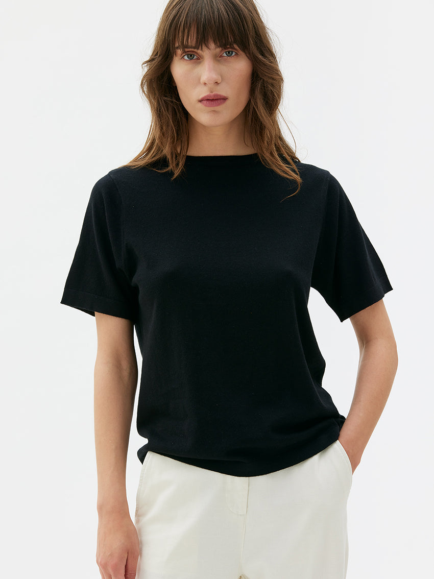 Indulge in luxurious comfort with the t-shirt style top, meticulously knitted in a unique fibre blend of cashmere, silk, and organic cotton.