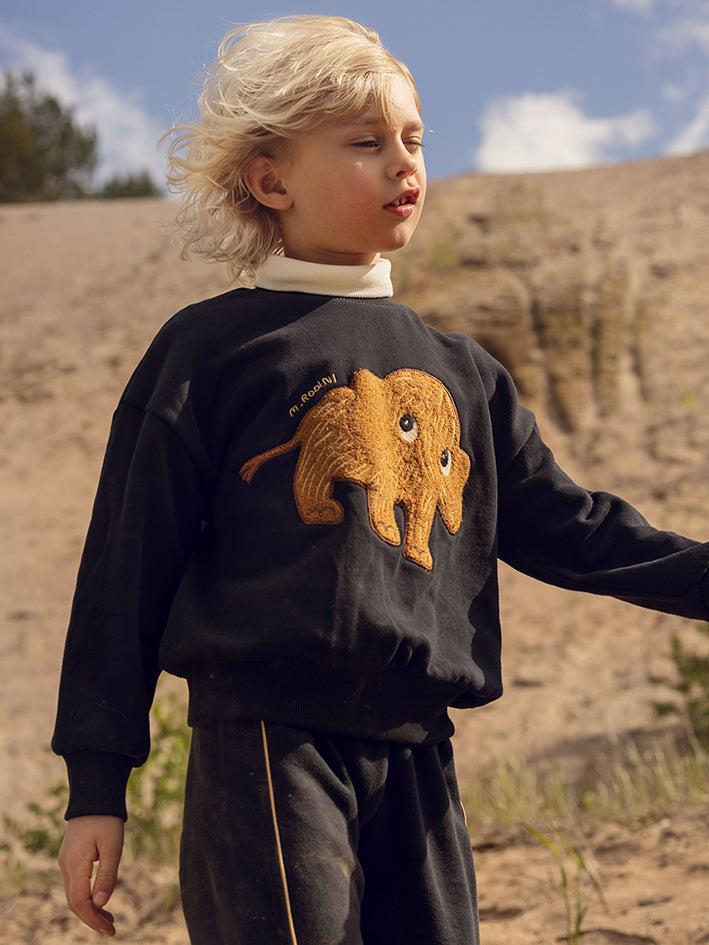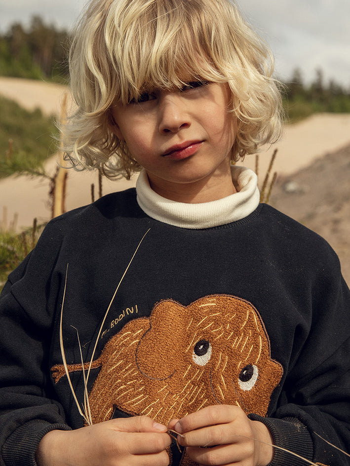 Mini Rodini only uses organic cotton certified by GOTS, or other certifications on products where GOTS isn’t possible. The producers follow international certification standards ensuring that the cotton content is grown without pesticides and with less water consumption than conventional cotton farming. Sweatshirt in Black with a large, fluffy Chenille Mammoth patch made from 100 % GOTS-certified organic cotton. Designed with dropped shoulders for a relaxed fit. Features • Chenille mammoth patch • Relaxed fit Material • 100 % Organic cotton • GOTS certified