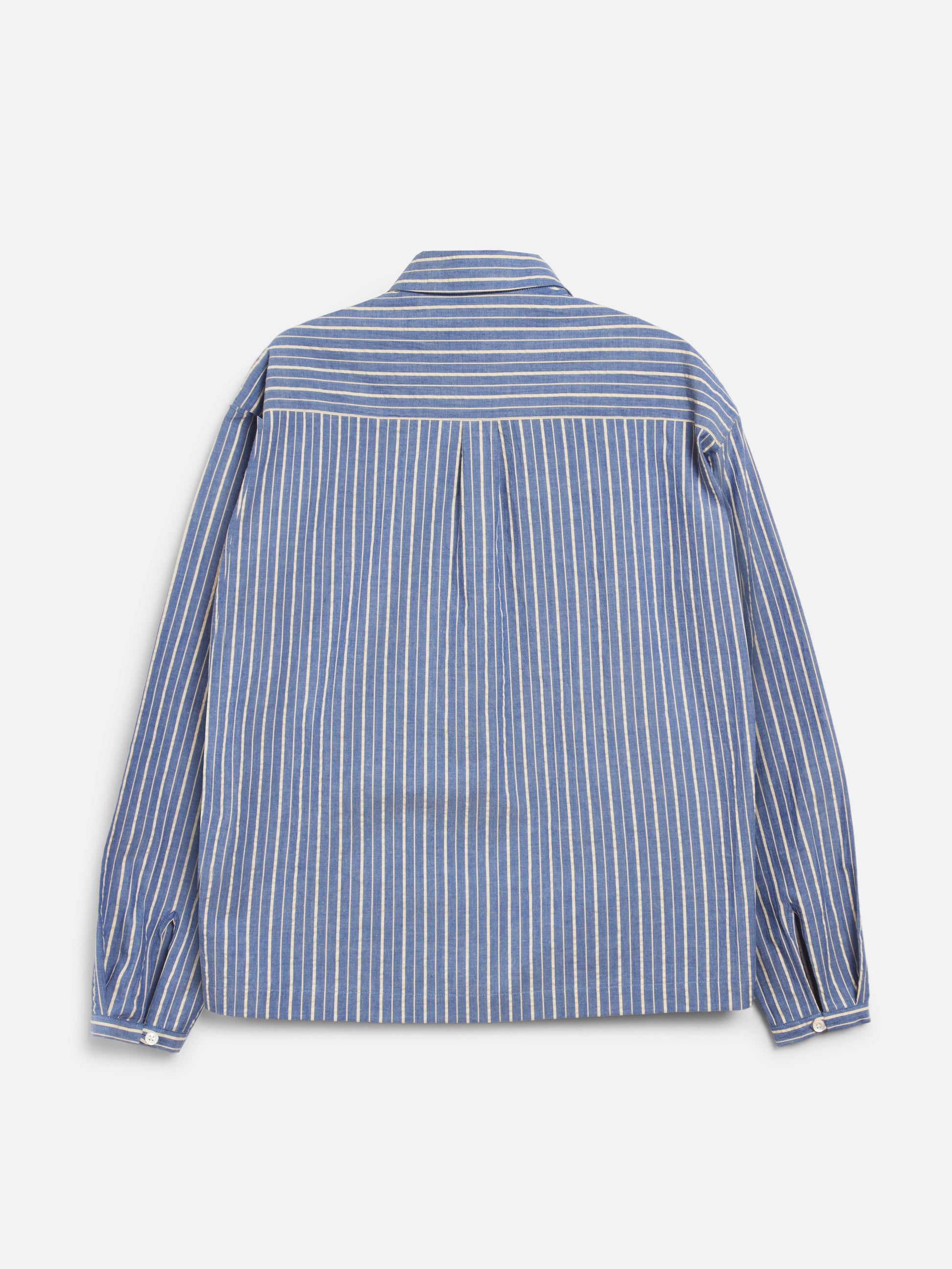 A long-sleeve shirt cut from Japanese mill-washed pinstripe cotton, designed with a two-piece collar, bias-cut front placket, and Mother of Pearl button fastening. Finished in a regular fit.