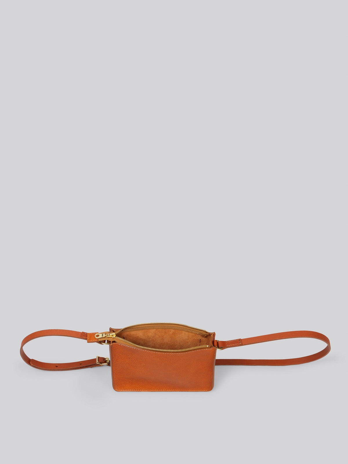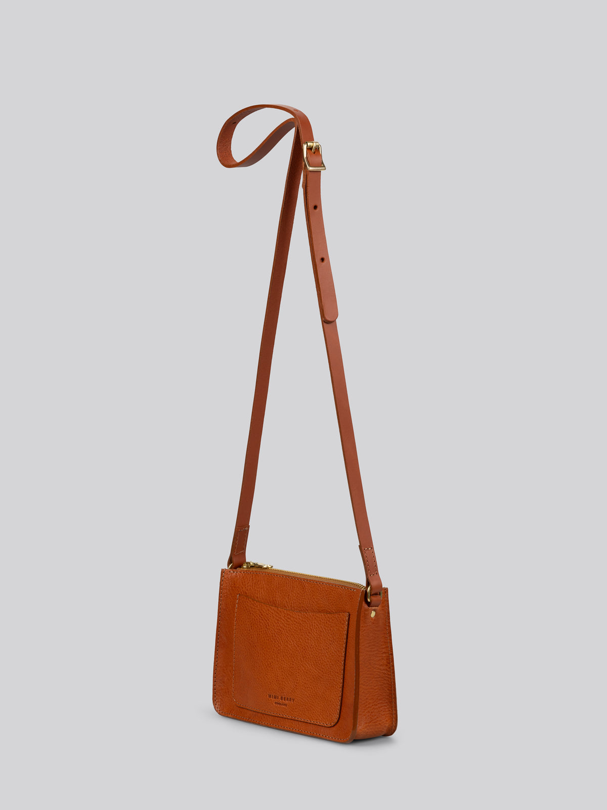 Small crossbody bag, featuring a secure zip-top closure made from Italian, grainy, veg tanned leather. Long, buckled, bridle strap. One back pocket. Brass fittings. Unlined.