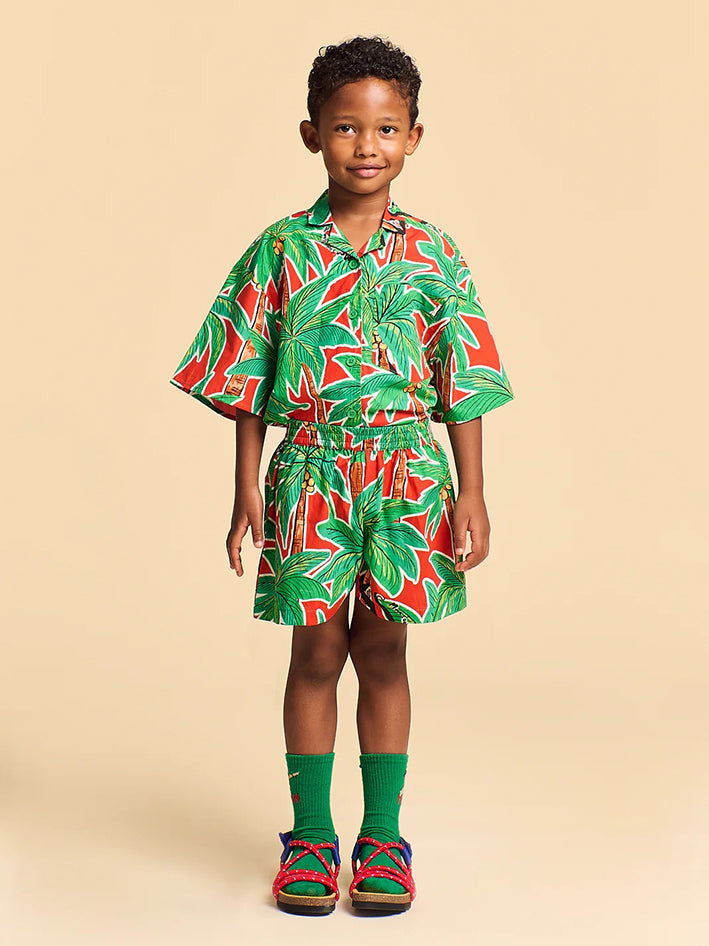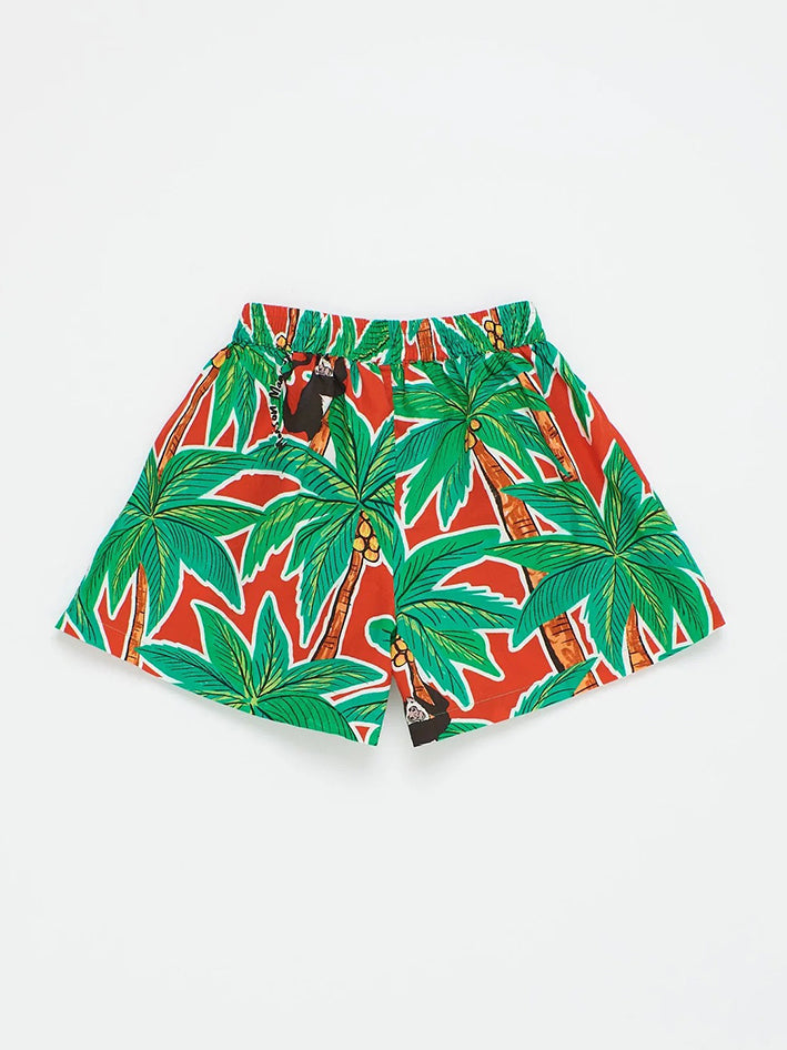 The Monkey Forest Short in Red by Maison Mangostan is a fun cotton short with an adventurous monkey forest all-over print. With an elastic waistband for the perfect fit. Made in India. Composition: 100% Cotton This item is normally sized, we suggest you select your regular size.