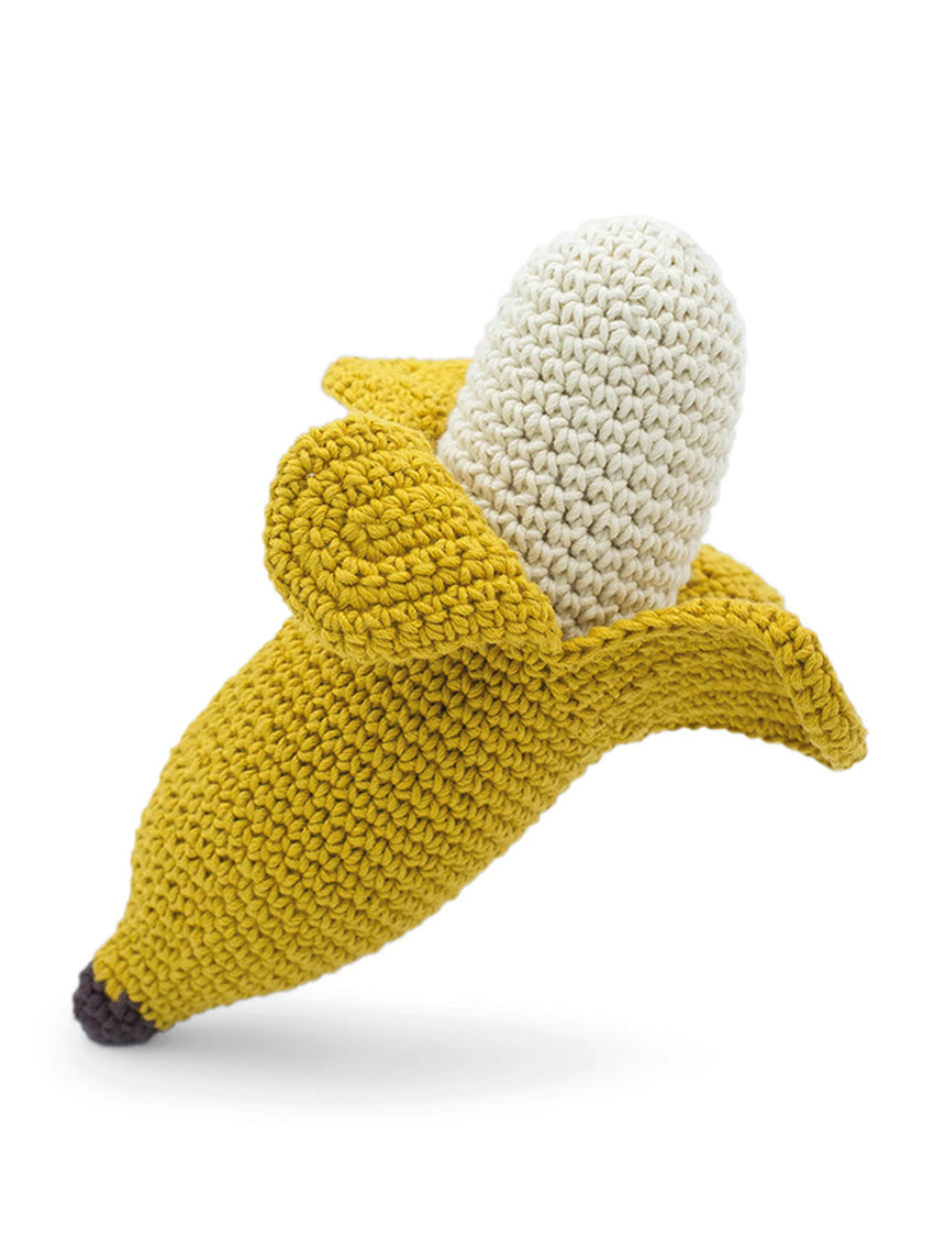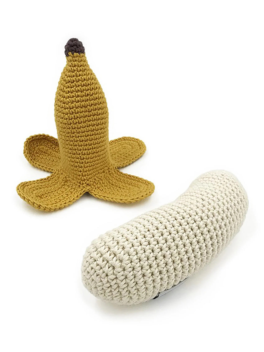 The Banana Rattle by Myum is made of 100% organic cotton. This is a Montessori inspired toy. Its texture in braided mesh stimulates the baby sensory and kinesthetic capacities. And the rattle it contains attracts its attention. The padding is also in cotton. Zero waste, its corn fiber packaging is reusable, recyclable and compostable. This toy is handmade by our crafts, women with fairy fingers. This toy is suitable from birth. It is tested by European (EN71 1.2,3 and 9) and American (ASTM F963) standards. It can be brought to the mouth safely. It is washable in machine (30°C). It is repairable and made to last, first a rattle, then a toy for the kitchen play.