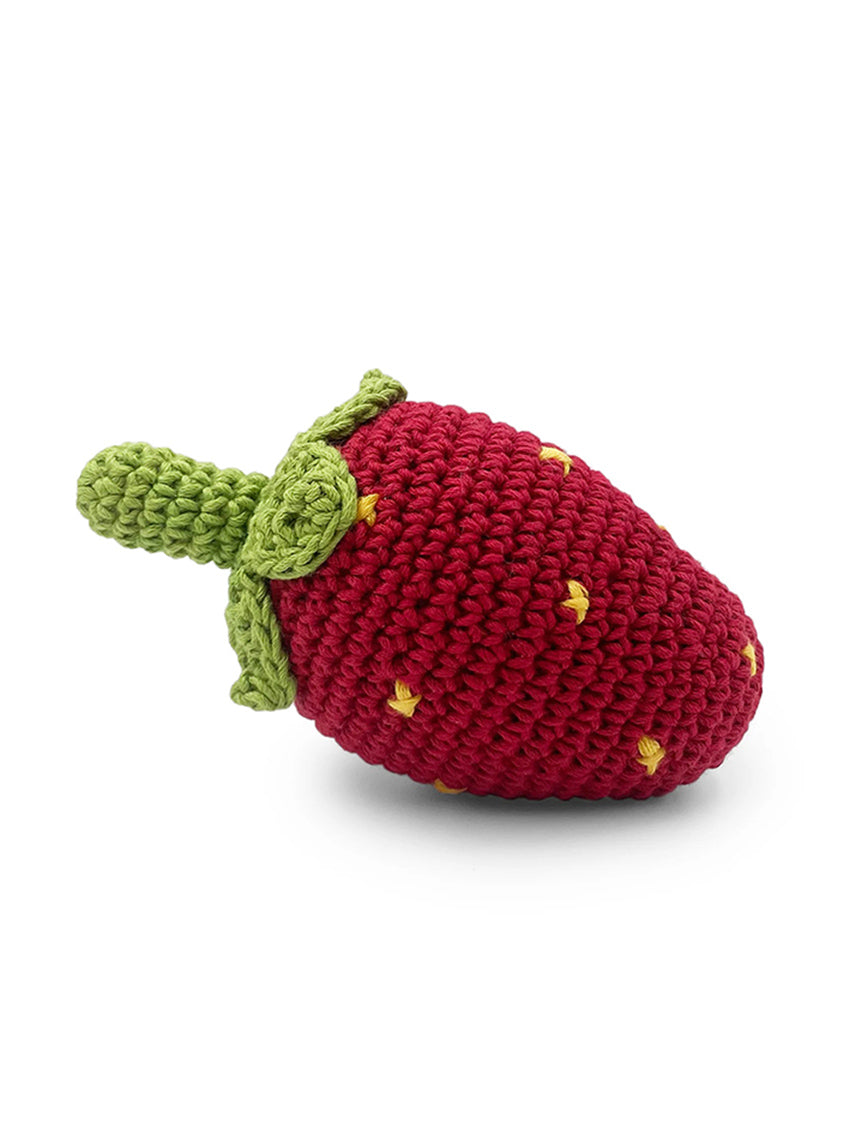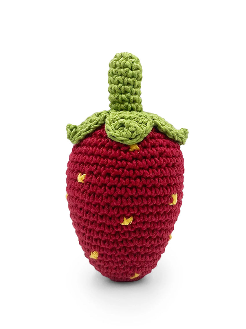 The Strawberry Rattle by Myum is made of 100% organic cotton. This is a Montessori inspired toy. Its texture in braided mesh stimulates the baby sensory and kinesthetic capacities. And the rattle it contains attracts its attention. The padding is also in cotton. Zero waste, its corn fiber packaging is reusable, recyclable and compostable. This toy is handmade by our crafts, women with fairy fingers. This toy is suitable from birth. It is tested by European (EN71 1.2,3 and 9) and American (ASTM F963) standards. It can be brought to the mouth safely. It is washable in machine (30°C). It is repairable and made to last, first a rattle, then a toy for the kitchen play.