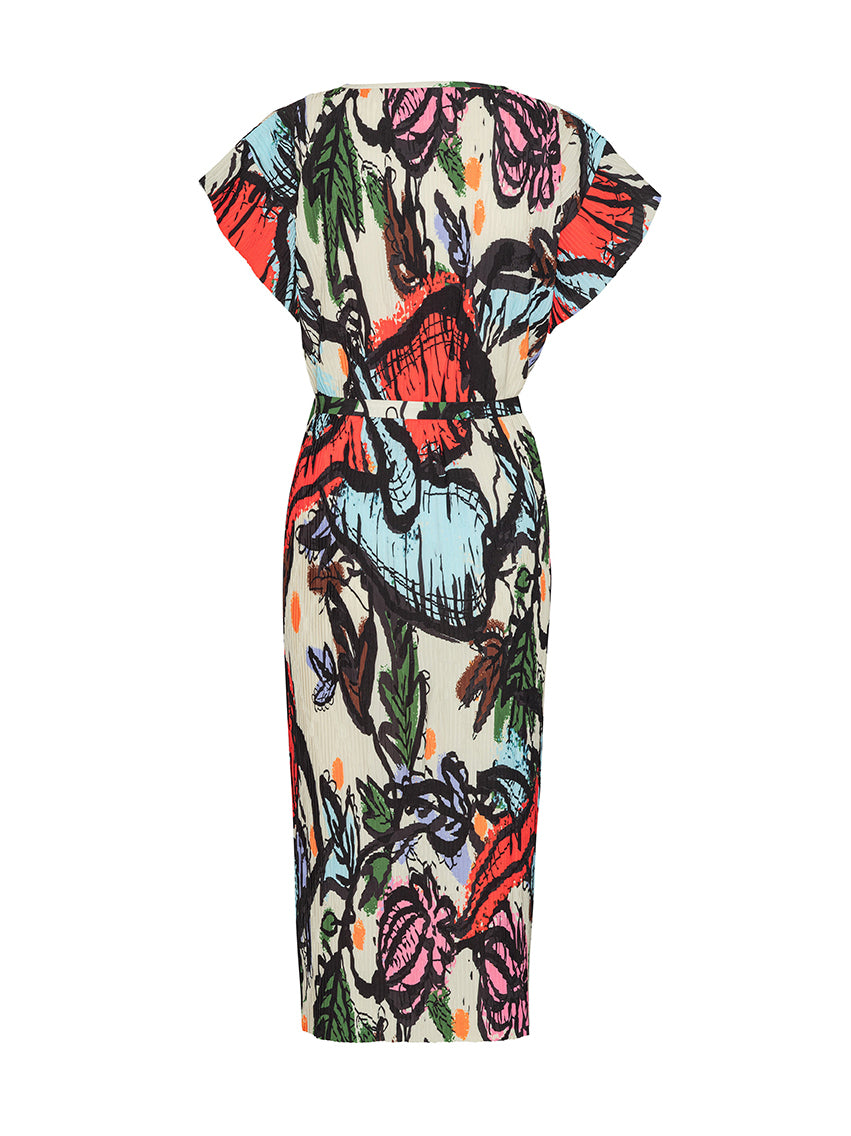 This multicolour dress features playful root vegetable illustrations, full plissé detailing, a round neckline, short sleeves, and a waist tie for a flattering fit.