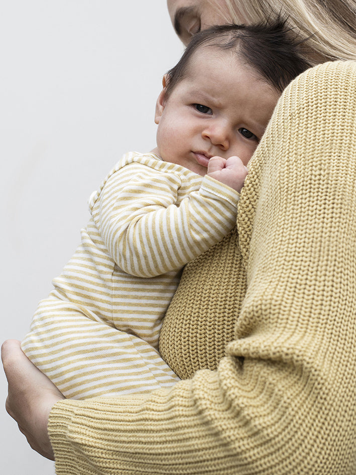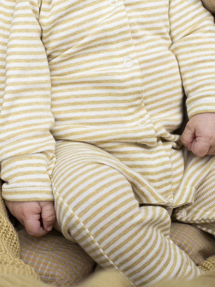Striped Onesie for Newborn and premature babies by Serendipity in a lovely Chamomille and Off-white colours. The Rip Suit is full length with long sleeves and feet, and opens with push buttons from neck to feet for easy and comfortable outfit changes. Made from our signature and super soft organic mélange cotton and is fully GOTS certified.