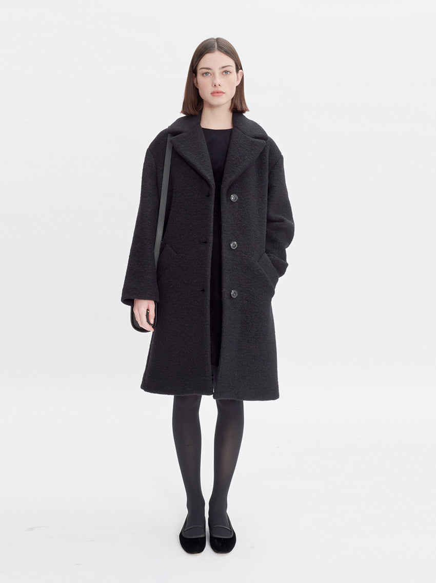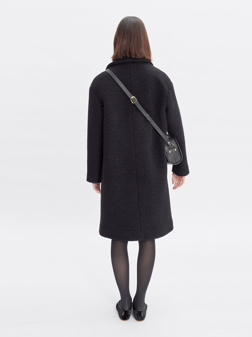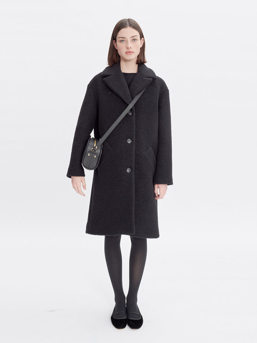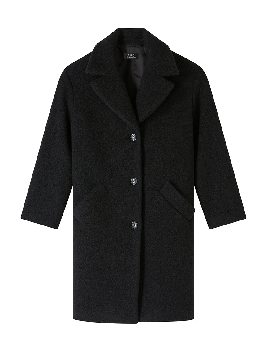 A.P.C. Ninon Wool Coat – Black. Crafted from high-quality Italian wool, this thick and warm black coat offers both elegance and functionality. Its straight cut and knee-length design ensure a flattering, minimalist silhouette. The tailored collar and faux horn button closure add a refined touch. Featuring two bottom pockets for practicality and a smooth viscose lining, this coat is as comfortable as it is stylish. Made with a blend of 75% wool, 25% polyester for durability and sustainability. Perfect for colder weather while maintaining a sophisticated look.