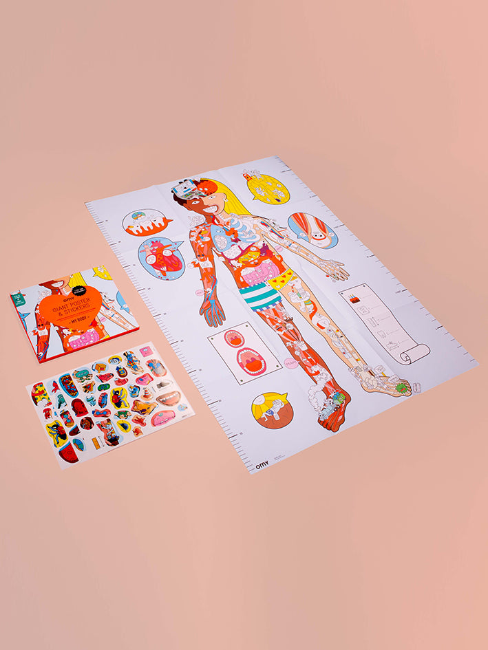 MY BODY - STICKER POSTER OMY - Giant poster + 100 stickers A fun activity to discover your body from head to toe ! Follow your kids growth with the growth chart on poster Hours of fun with a giant Search and find activity with more than 100 stickers to play with. Neon fun illustrations Format Unfolded : 39,4 x 27,6 in Composition 100 % paper Made and designed in France by OMY