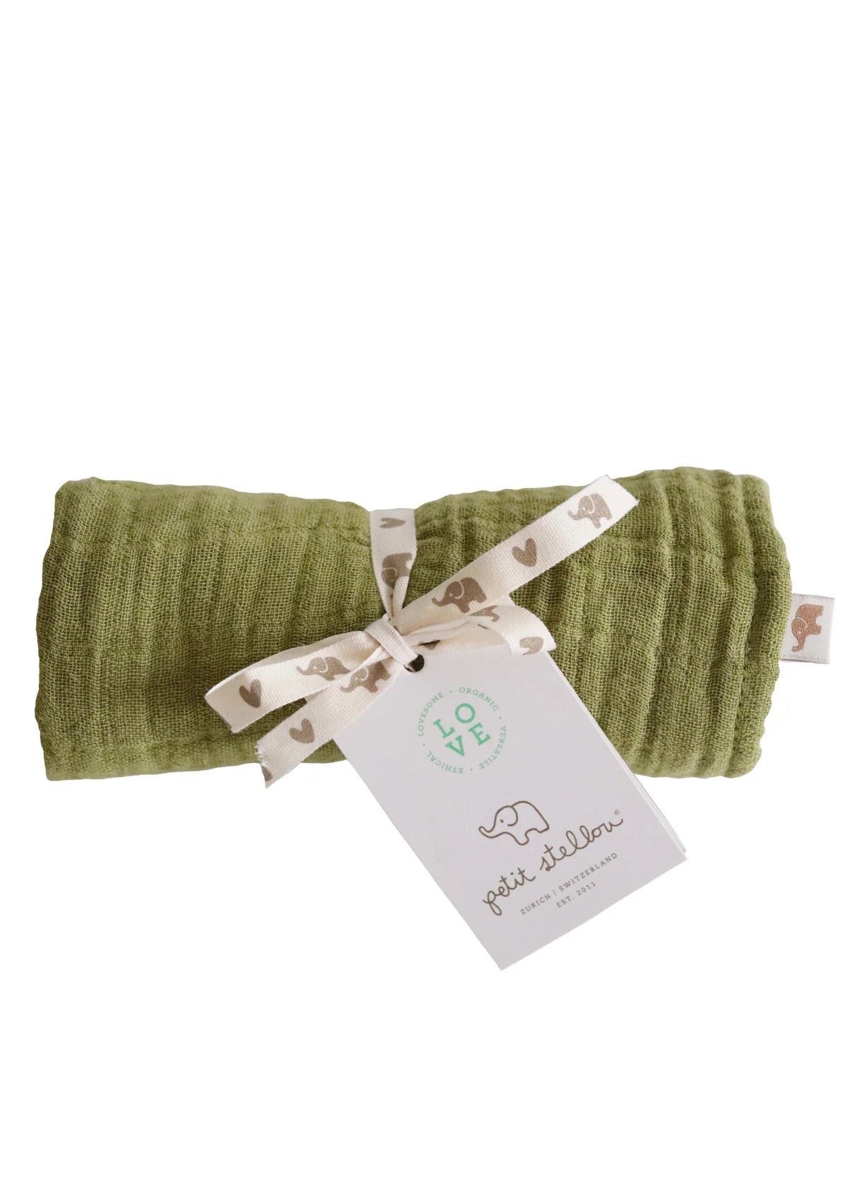 The Petit Stellou Nooshi in Olive is to cuddle and snuggle ... for at home and on the go ... instantly protecting baby's sensitive head from sunshine or wind ... stylish dry bib ... In baby soft, "soft pre-wash-crinkle" quality. Size: approx. 65 x 65cm Material: 100% GOTS certified organic muslin cotton Made in Portugal - Good from the start!