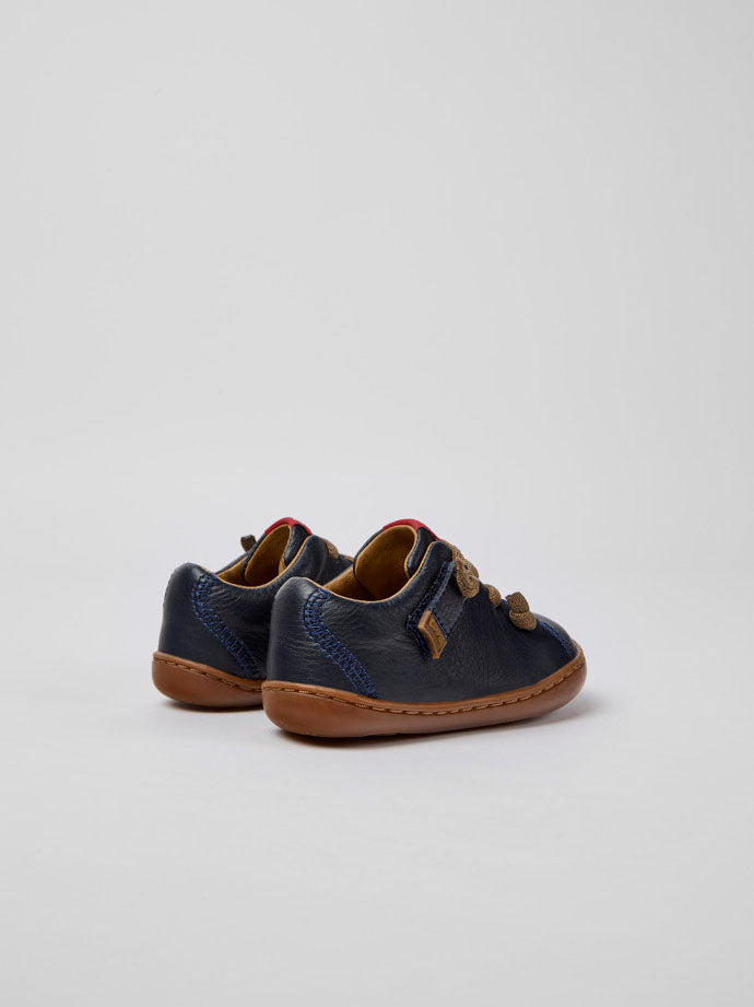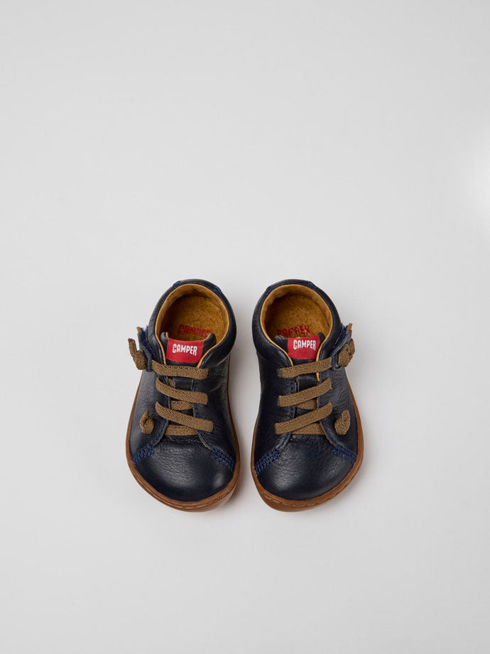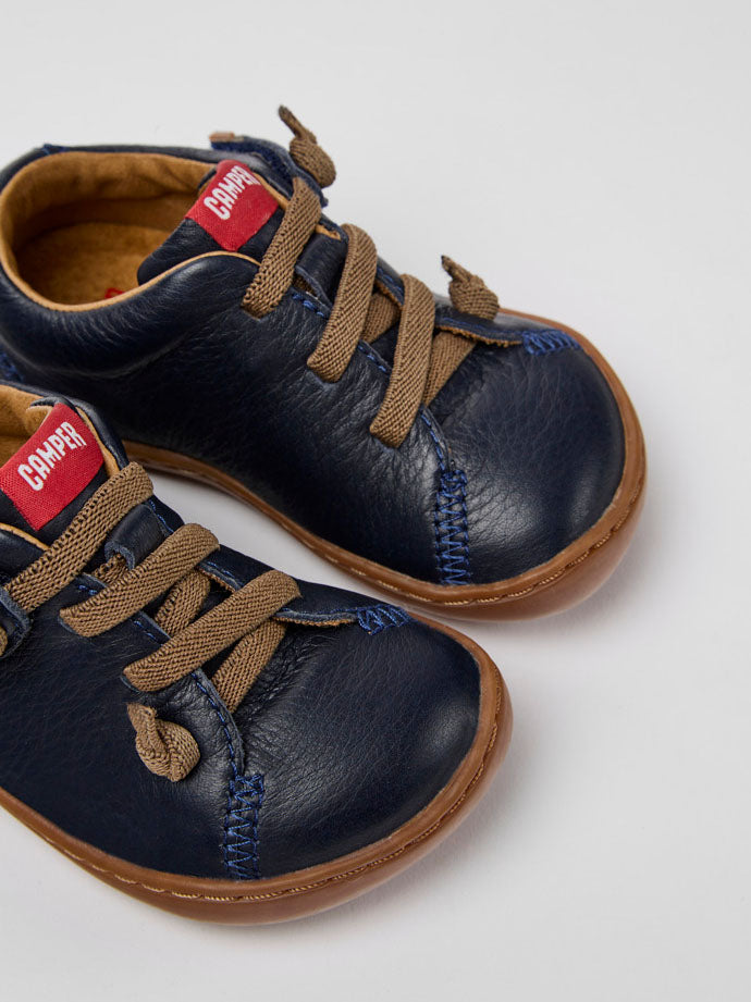 Navy Blue leather kids' shoes with Elastic laces and rubber outsoles (20% recycled). A Camper Icon that evolves with every season. Peu is functional simplicity inspired by walking barefoot. It is 360-degree stitched and built with a Strobel construction technique, guaranteeing unmatched flex and durability under any conditions.