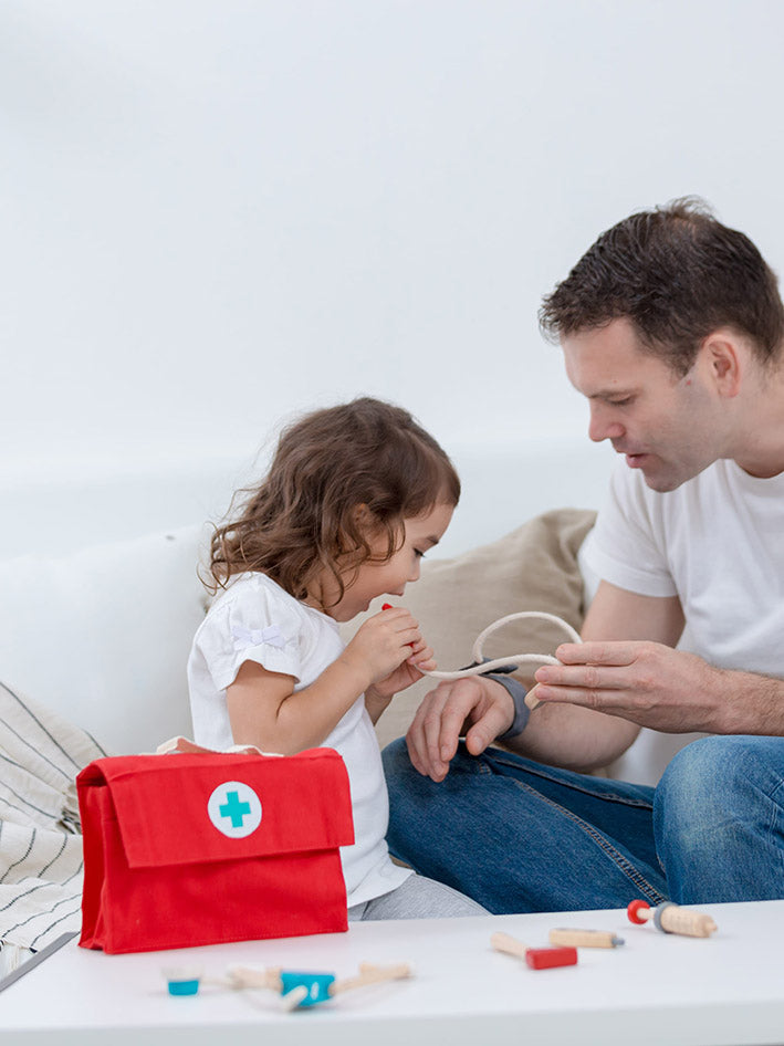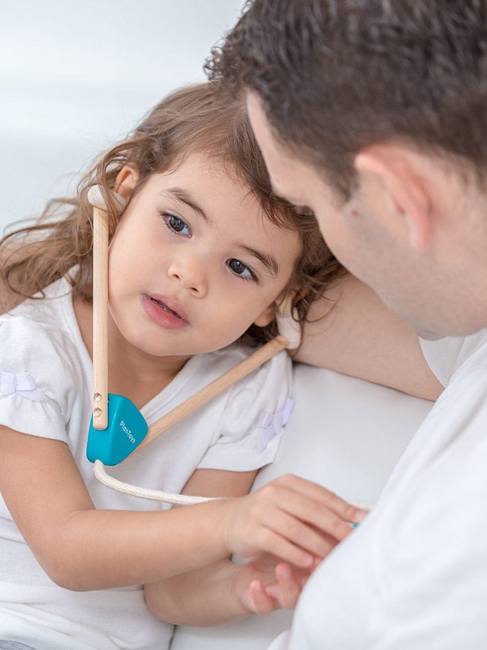 PRETEND PLAY: Diminish your little one's fear of the doctor's office with the PlanToys Doctor Set. Introduce children to the tools that doctors use and let them become a doctor on their own! Role play as a pediatrician check a fluffy friend's heart rate or monitor a sibling's blood pressure. Your child's imagination can run wild here! SUSTAINABLY-MADE: Crafted with planet-friendly rubberwood and stained with non-toxic water-based dyes the playset's pieces are free from sharp edges and toxic chemicals. INCLUDES: 5 pieces of medical equipment - including a stethoscope blood pressure monitor thermometer syringe reflex hammer and handy red soft cotton case. Suitable for children 3 years and older. Product Dimension 8x21.5x14.5 cm