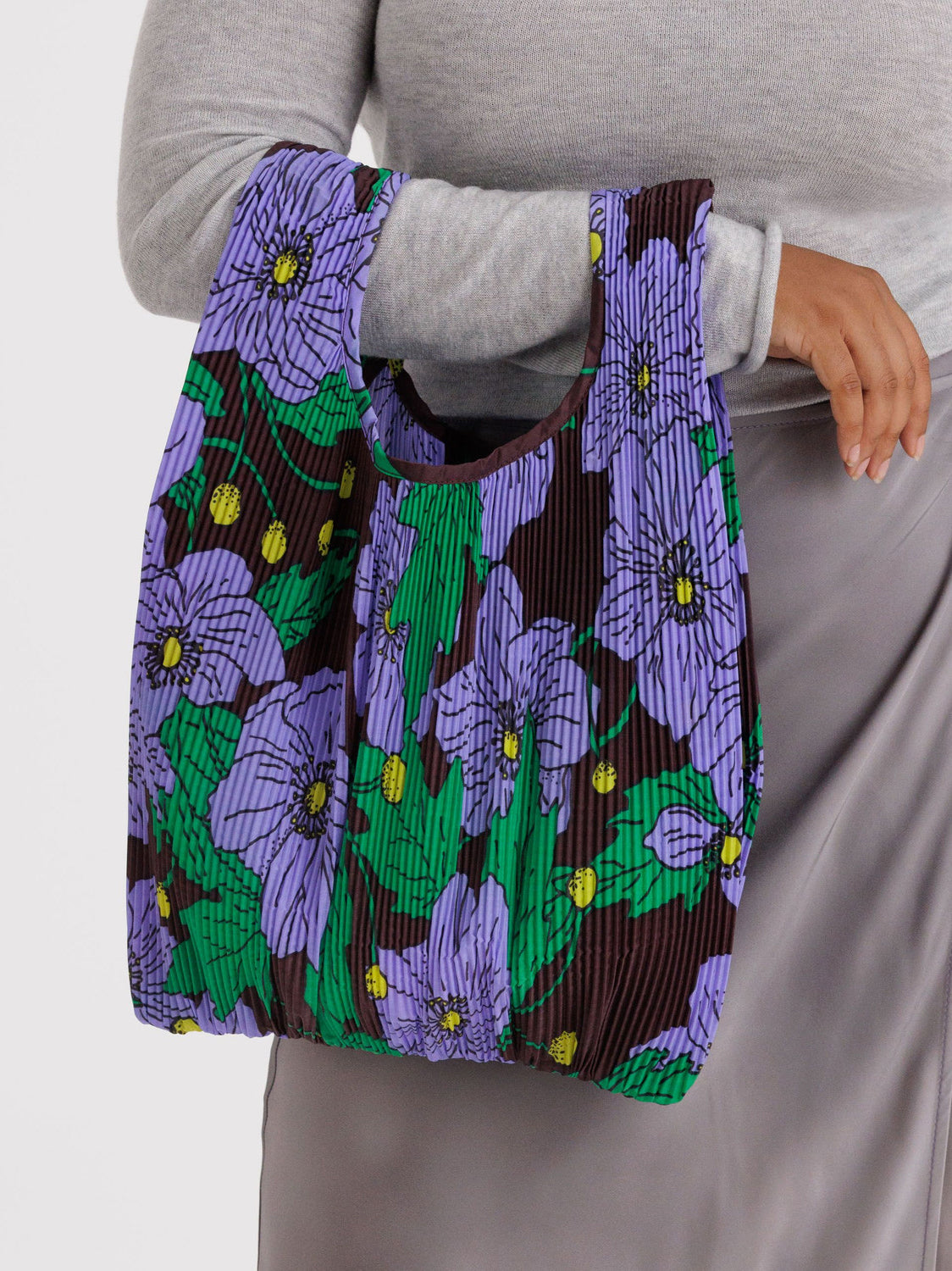 A special, pleated version of the classic Baby Baggu shape that can be worn as a dressier, fashion forward catch-all bag.