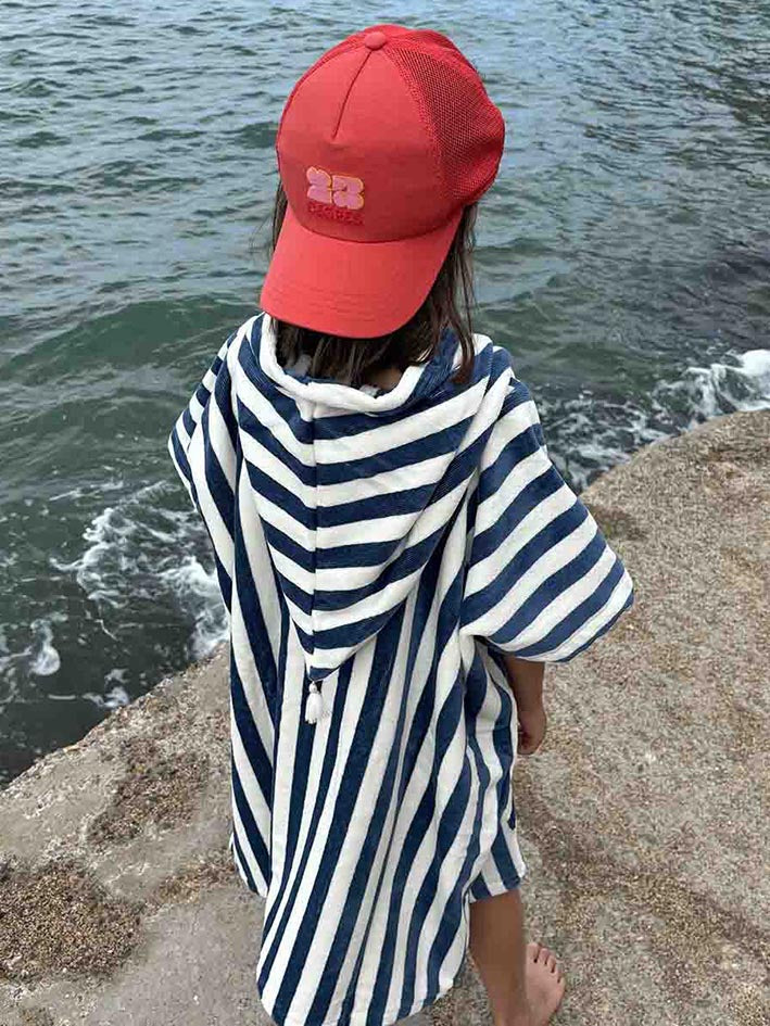 The Suzon Stripes terry toweling bath Poncho in Blue Midnight from Rose in April will be perfect for drying your little ones after getting out of the bath. Your children will love wrapping themselves up in it! Also use for trips to the beach or swimming pool. Dimensions: 1/3 years - height (from neckline to bottom of poncho): 49cm, width: 52cm. 4/6 years - height (from neckline to bottom of poncho): 62cm, width: 65cm Composition: 100% Cotton terry - 380gr Made in Portugal Cotton OEKO TEX certified