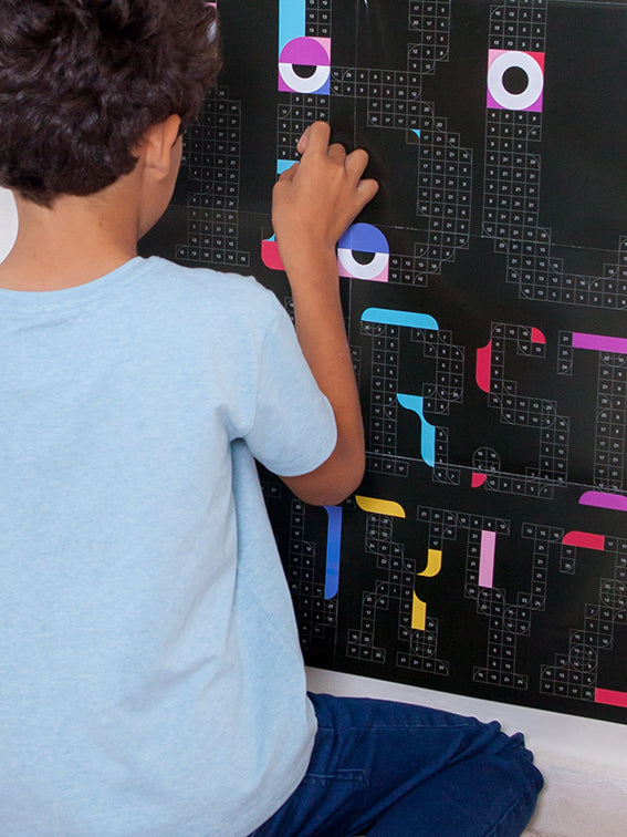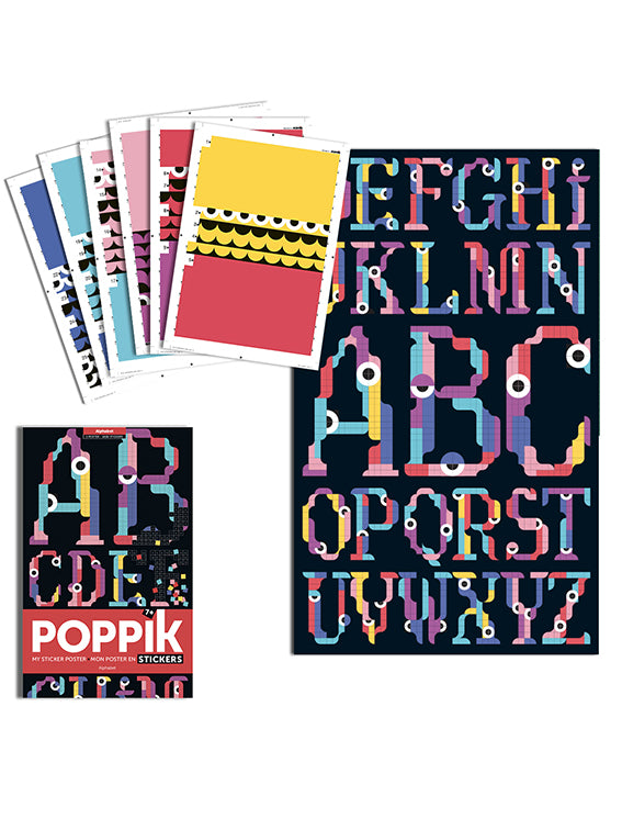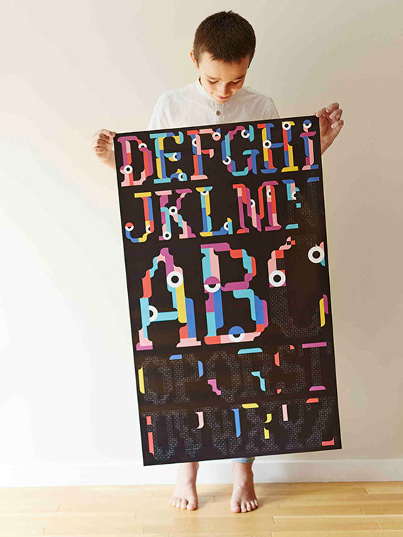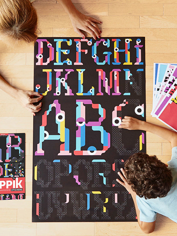 This alphabet was created by a duo of French typographers: Cheeri. They invite us to play with the small square stickers to create crafted and decorative initials with original curves and colors.