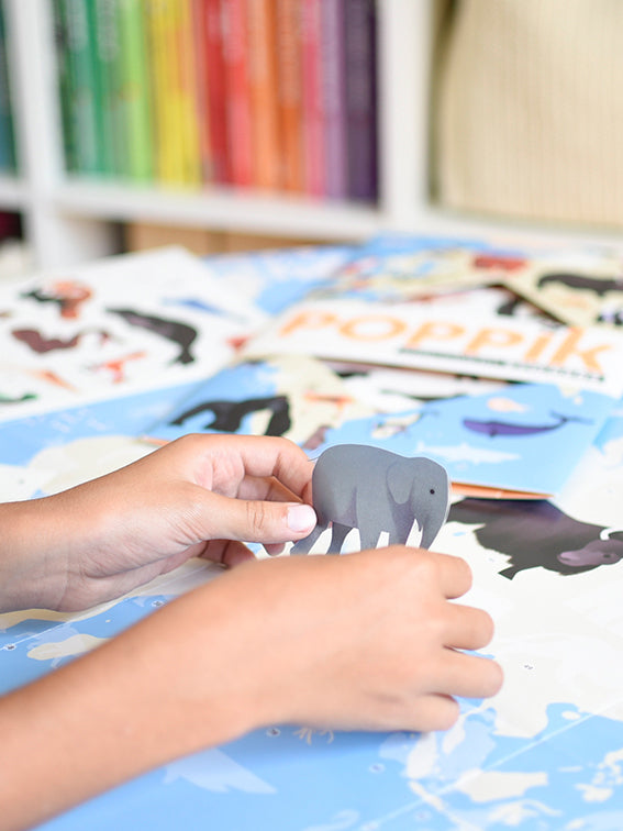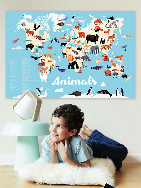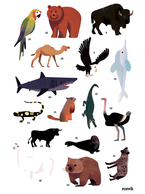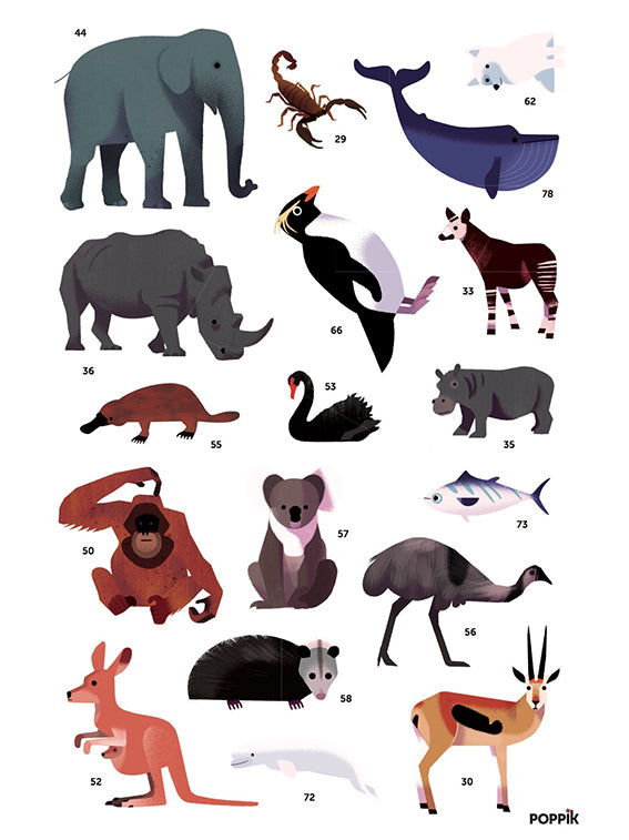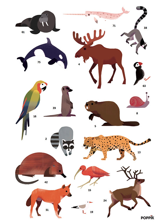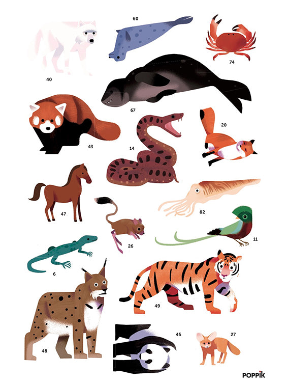 Unfold the large poster and stick the most famous animals of the world: fox, wolf, polar bear, narwhal, panda, koala, kangaroo ... A numbered code makes it easy to recognize the good location of each animal. On the the notice in 5 languages (English, French, Spanish, German and Italian), you will find the names of the animals.