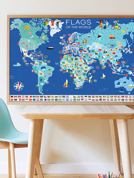 Unfold the large worldmap and stick the flags of the 197 countries recognized by the UN. A numbered code makes it easy to recognize the correct location of each flag. On the note in 5 languages (English, French, Spanish, German and Italian), find the name and the capital of all these countries.