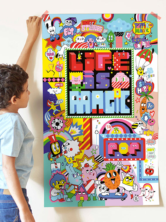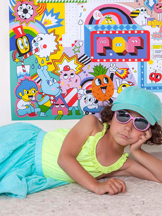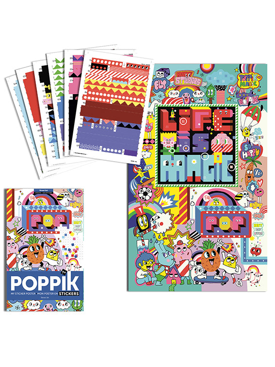 The street art was born 50 years ago, when artists began to of an art visible by everyone in the streets. This multi-faceted movement has spread across all continents. The artist Lili Scratchy winks at Street Art with this poster filled with happy, colorful, graffiti-like drawings.