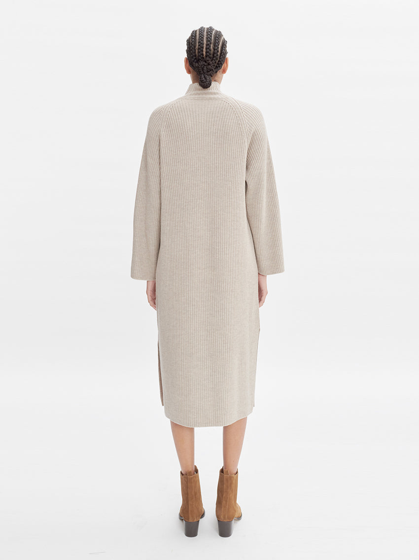 A.P.C. Prisca Knit Dress in Heather Putty. This dress seems like a chic and cozy option, perfect for cooler weather with its soft ribbed wool and warm design. The straight cut, raglan sleeves, and mock polo neck create a minimal yet elegant silhouette, and the side slits add a modern touch. The below-knee length keeps it versatile for various occasions, while the 100% wool material ensures warmth and comfort.