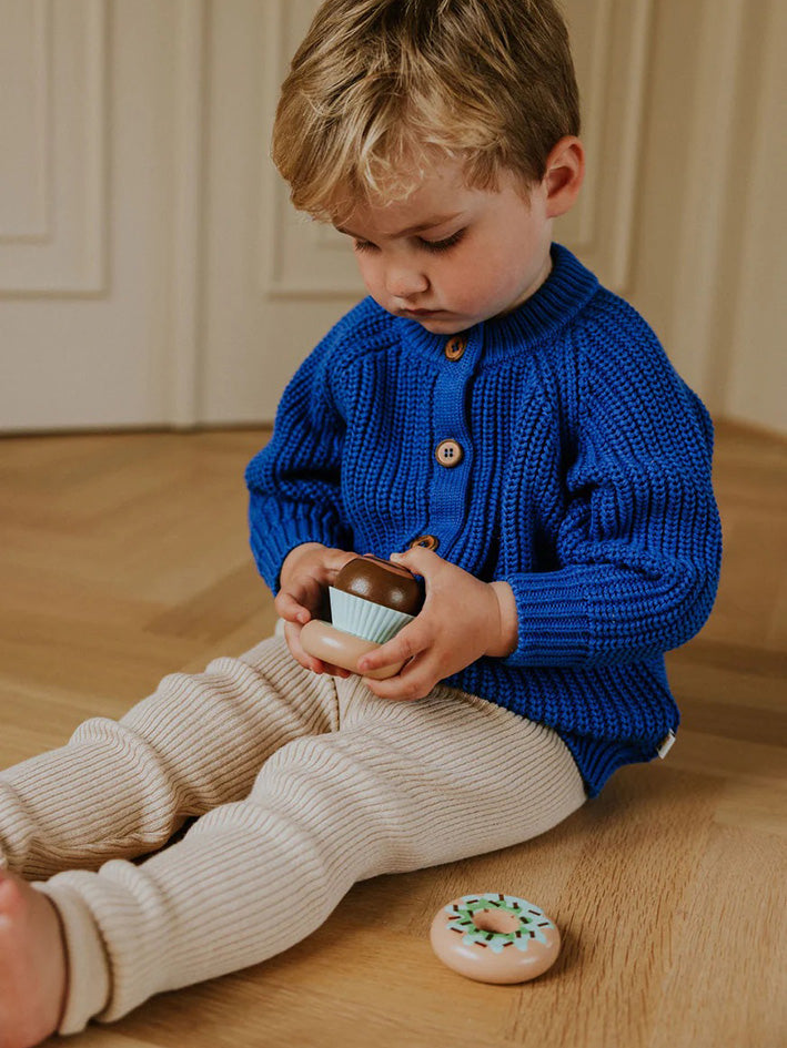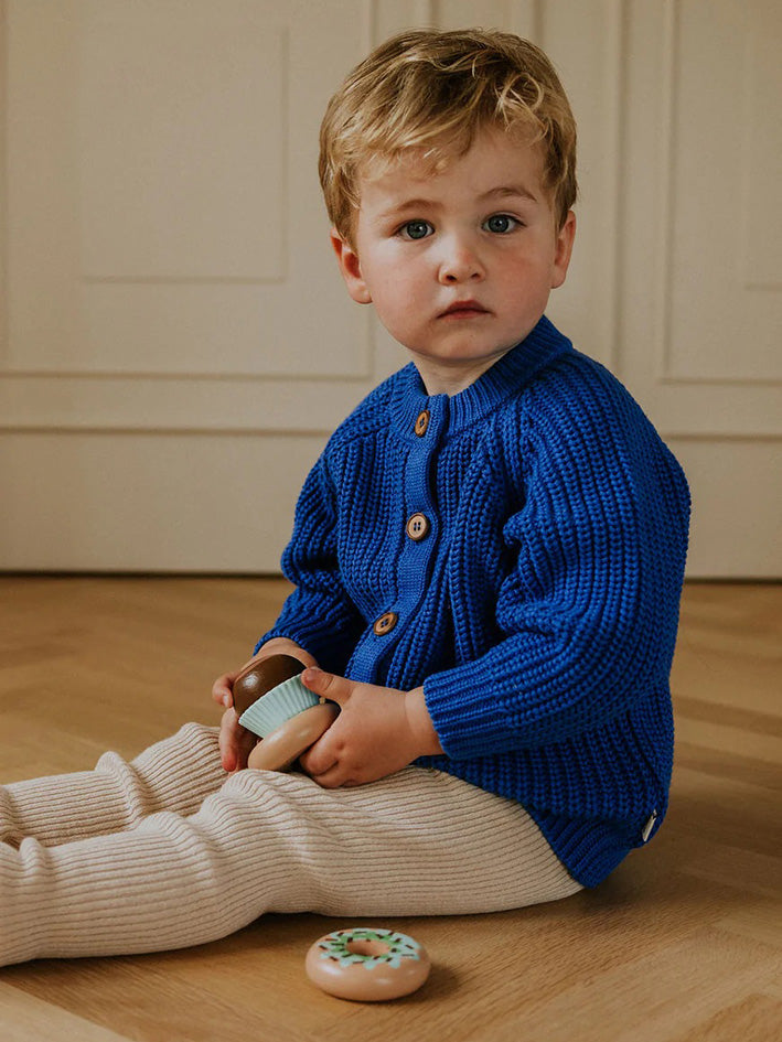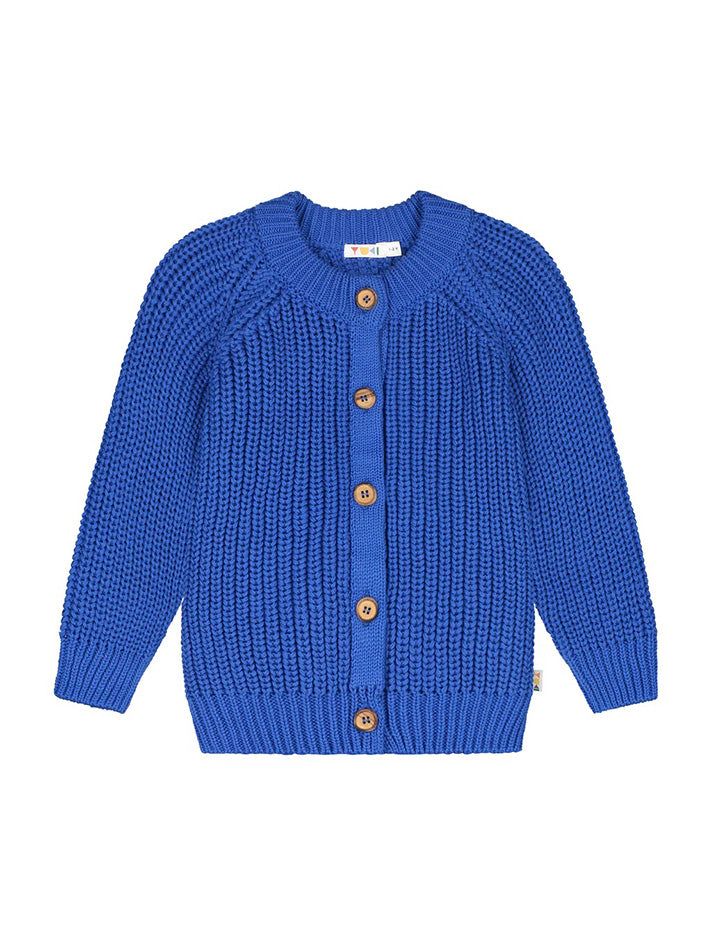 This unisex Knitted Raglan Cardigan in Blueberry from Yuki Kidswear is made with 100% organic cotton and yarns that are Gots and Oekotex® certified.