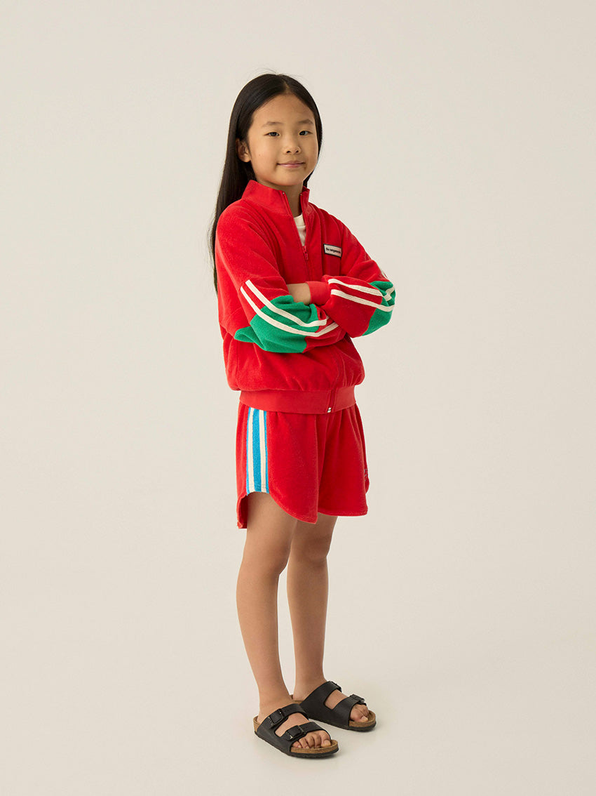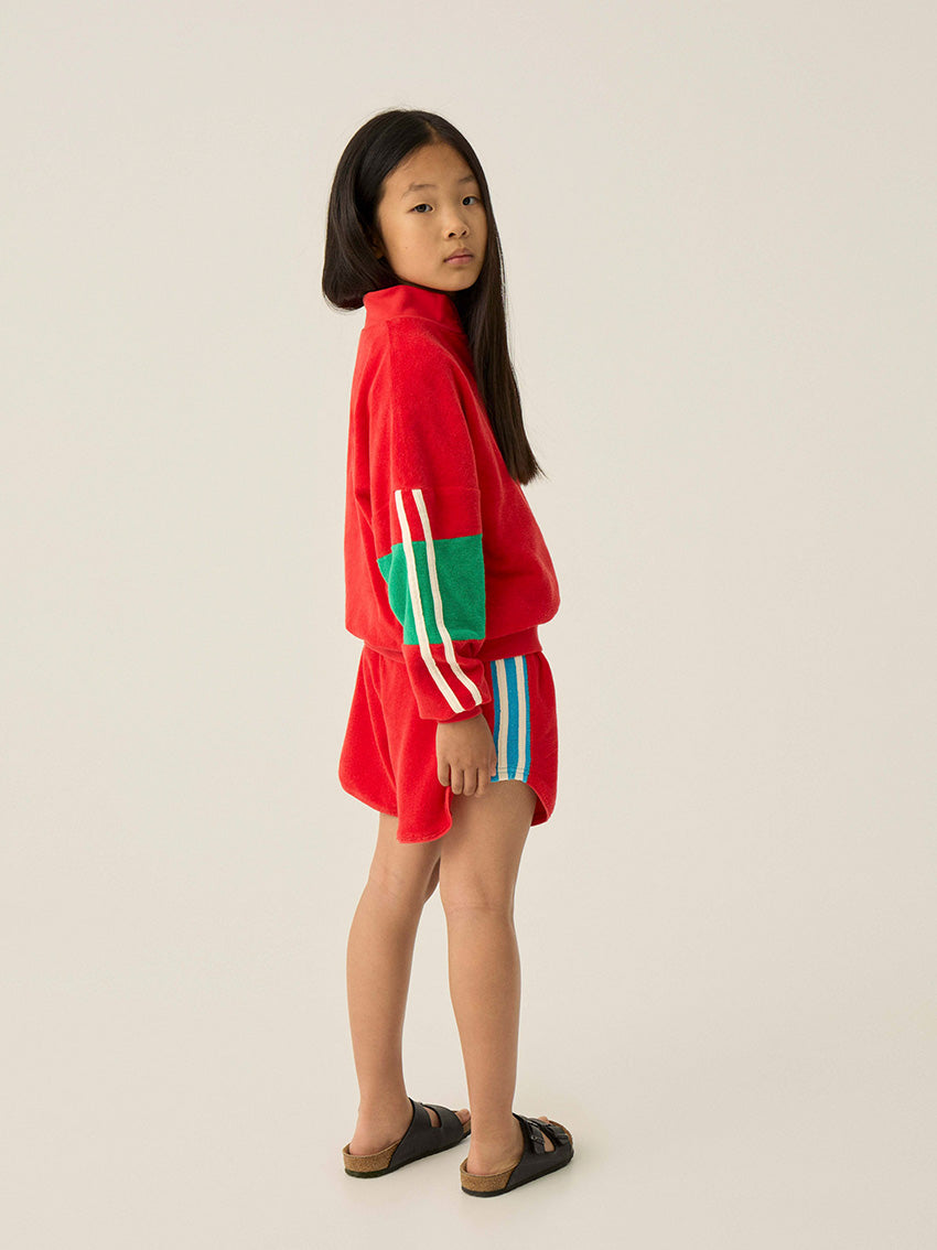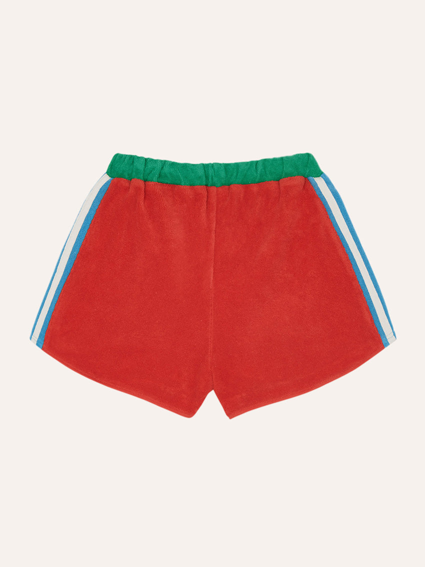 With retro vibes, these red shorts are made in terry fabric with contrast bands in the sides. They have elastic band in waistband for more comfort. Wear them all summer!