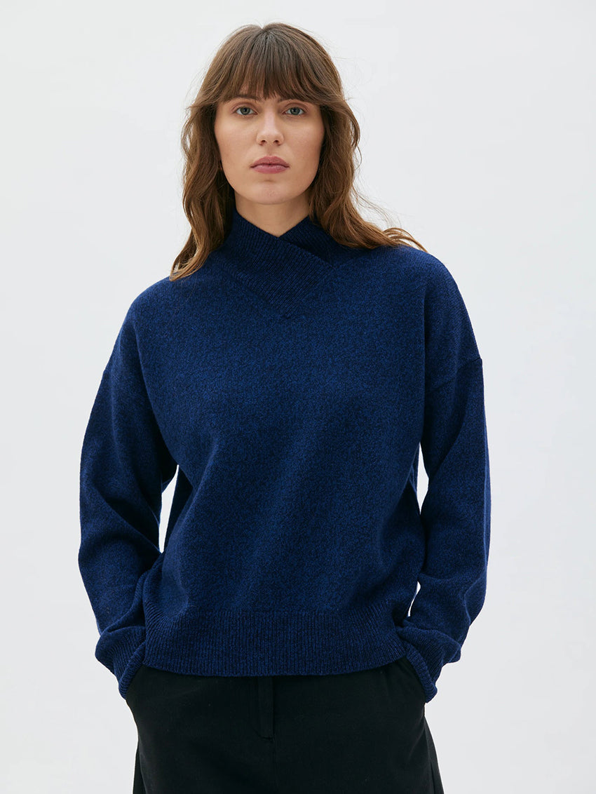 The Maska Runo is a cozy, knitted sweater that features an enveloping wrap collar, casual dropped armholes, and ribbed trimmings.