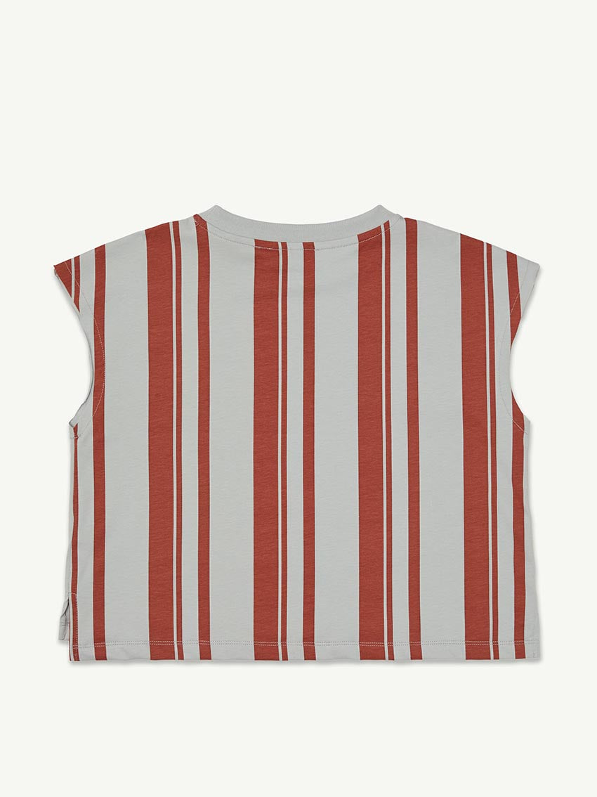 The Shell Top in Pearl Blue Stripe has a loose, boxy fit with a ribbed neck, side splits, and cut off sleeves with raw finish. The printed stripe adds a fun, retro summer vibe and is cut from soft organic cotton.