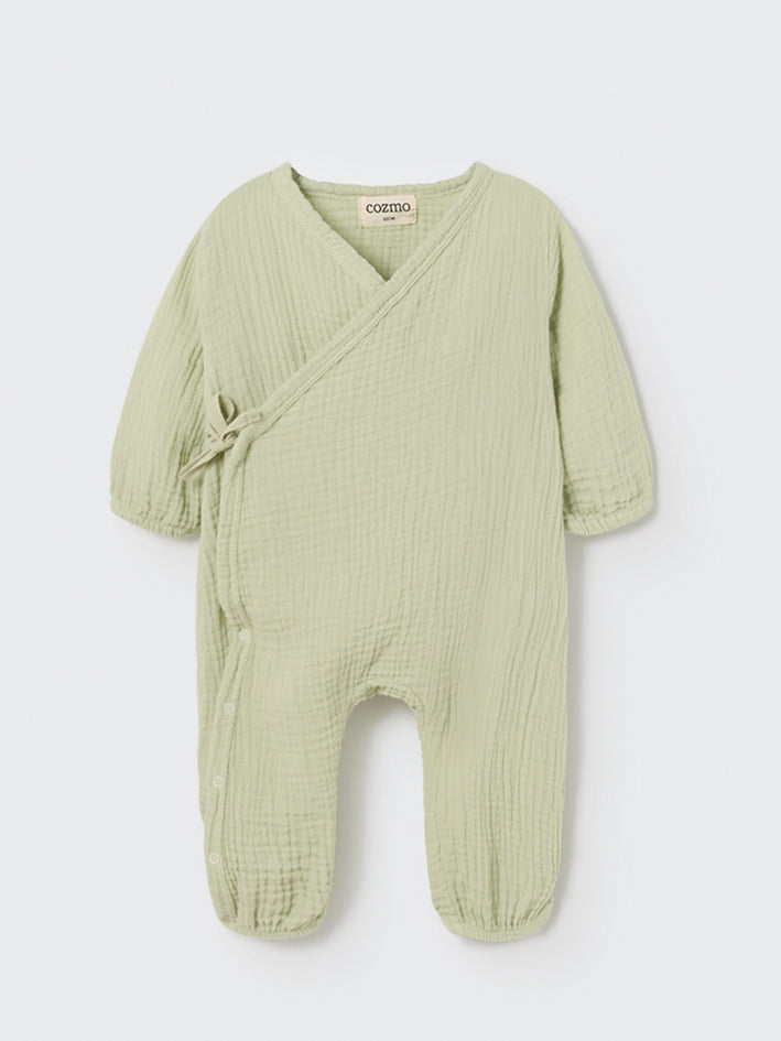 Wrap your little bundle of joy in ultimate comfort and style with the charming Muslin Newborn Jumpsuit in Green by My Little Cozmo! Jumpsuit for newborns in fluffy, light cotton gauze. V-neckline and a wrap-over closure for easy on and off. Snap buttons inside. Ribbons that tie at the chest. Snap buttons alongside the right side. Long sleeves and legs. Elasticized cuffs and hems. Naturally wrinkled texture. Non-iron fabric. 100% WOVEN COTTON