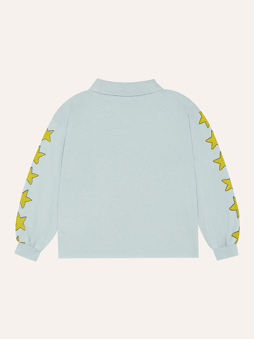 Retro vibes in this blue washed polo with star printed on the sleeves. With oversized fit and rib in cuffs for more comfort. It is a very versatile garment that close any summer outfit.