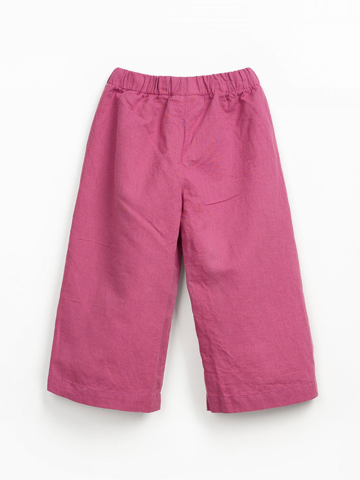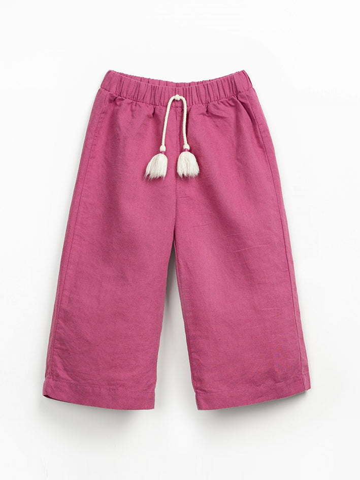 These Play Up Trousers are made of linen and organic cotton fabric, in the Stories Pink color. They are a wide palazzo model with an elastic waistband and an adjustable cord with decorative pom-poms, finishing with slightly tapered legs. 52.0% Linen,48.0% Organic Cotton