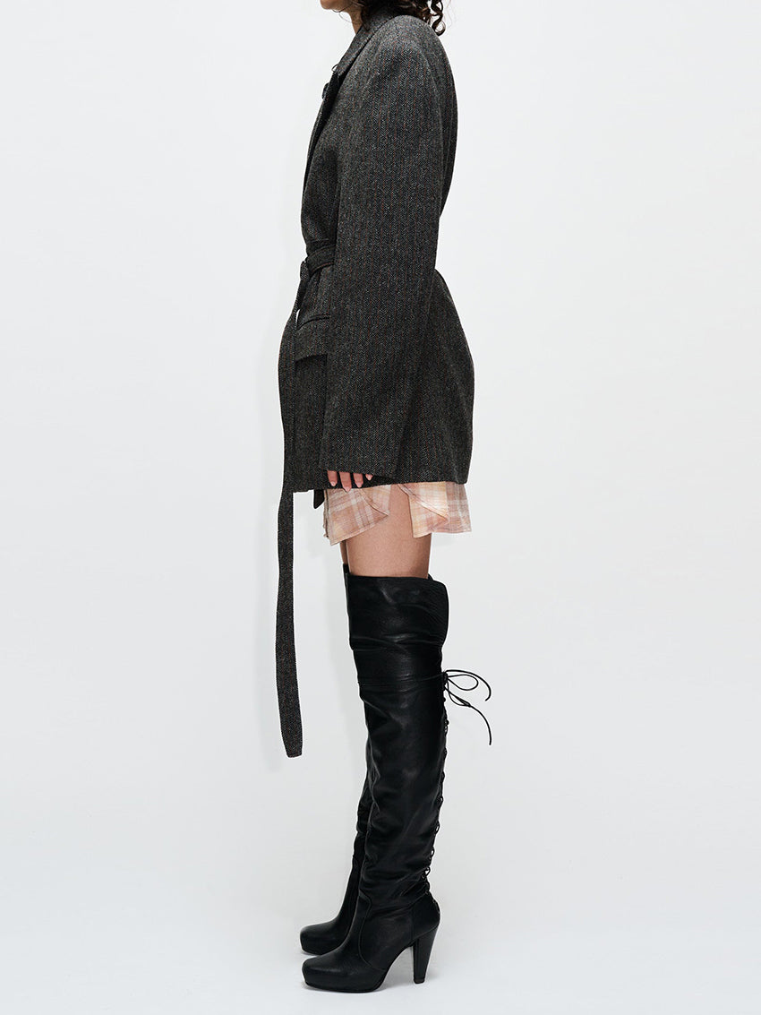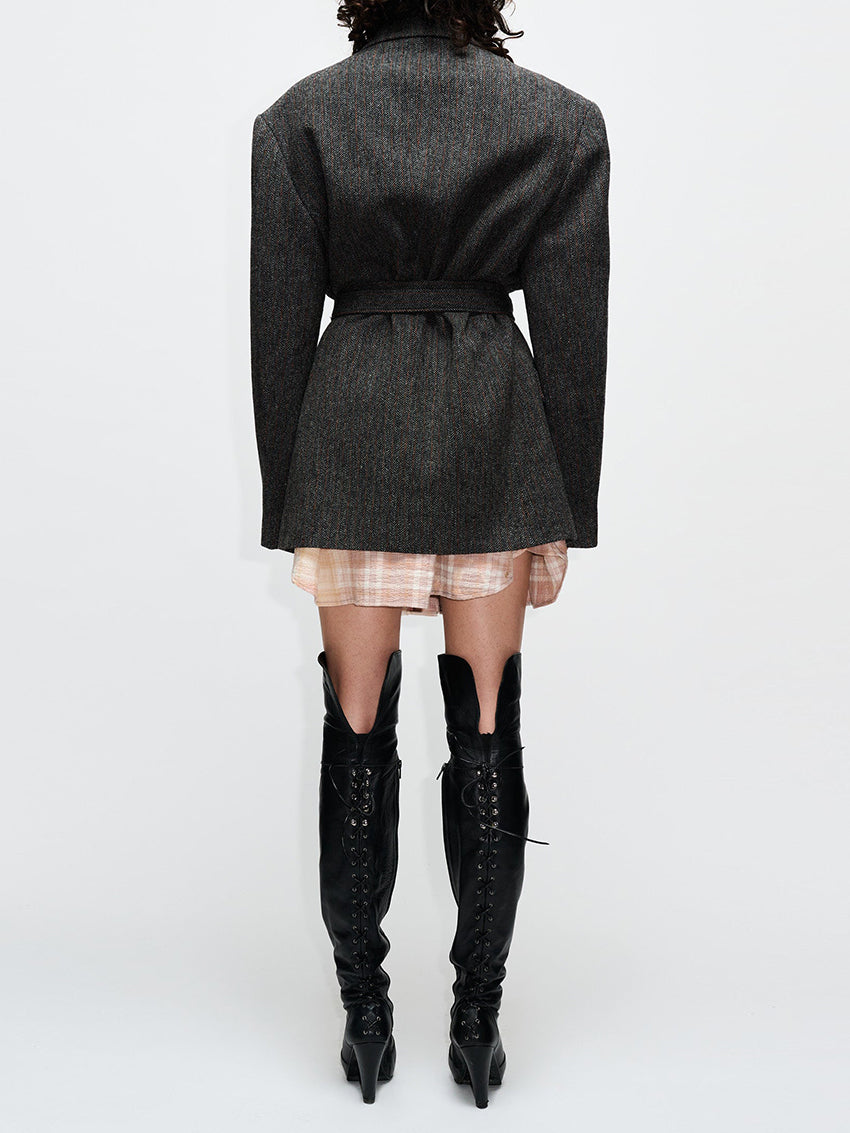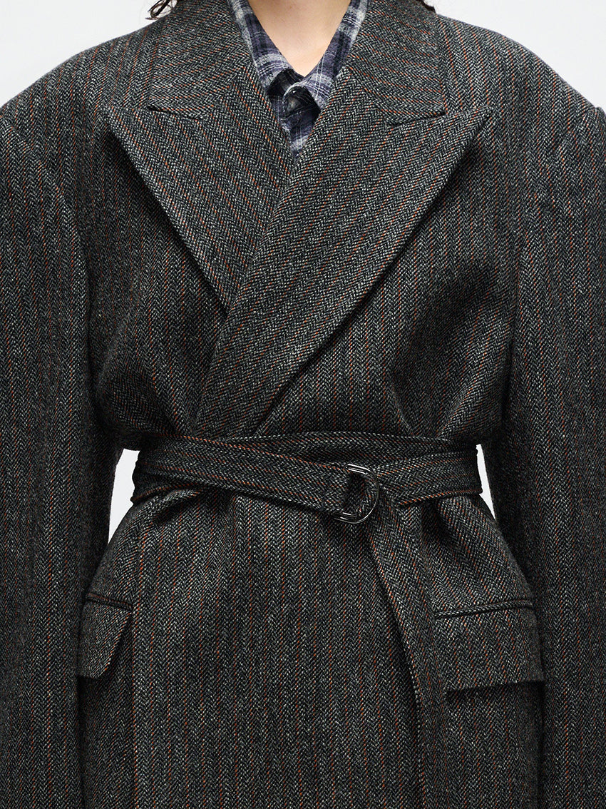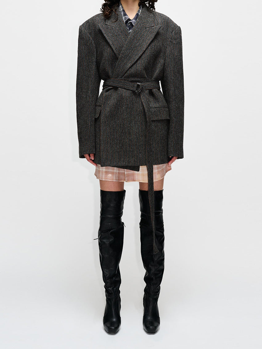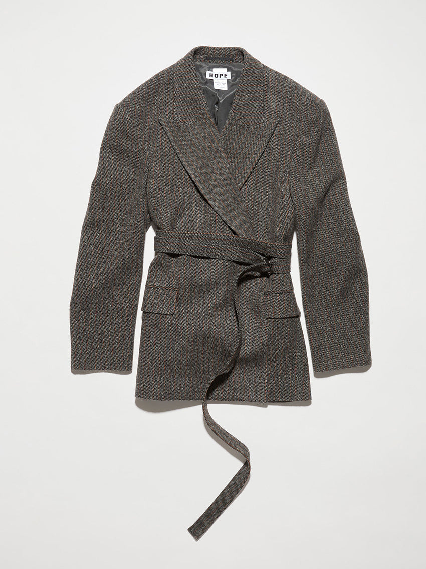 The Hope Strava Blazer in Grey is a wide-shouldered wrap blazer crafted from a vintage Herringbone fabric with an orange stripe. Details include double-jetted pockets with flaps, coroso buttons, and a shell fabric belt with D-rings for closure. - Wrap blazer - Double-breasted - Classic detailing - Coroso buttons - Viscose lining - Striped sleeve lining - 3 inside pockets - 100% Wool - Model is 173 cm / 5´8" tall and wears a size 36