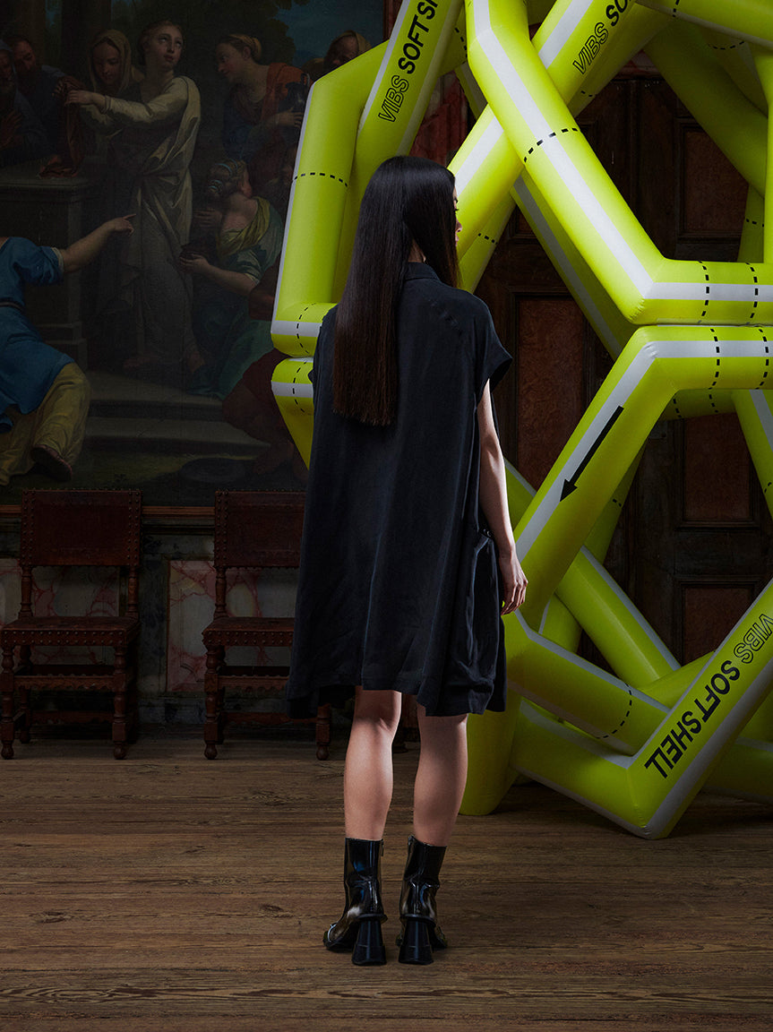 Suit Cover Dress in black from Henrik Vibskov’s Spring/Summer 2026 Studio Collection “Everything Cracks Eventually – I’ll Be Gentle.”