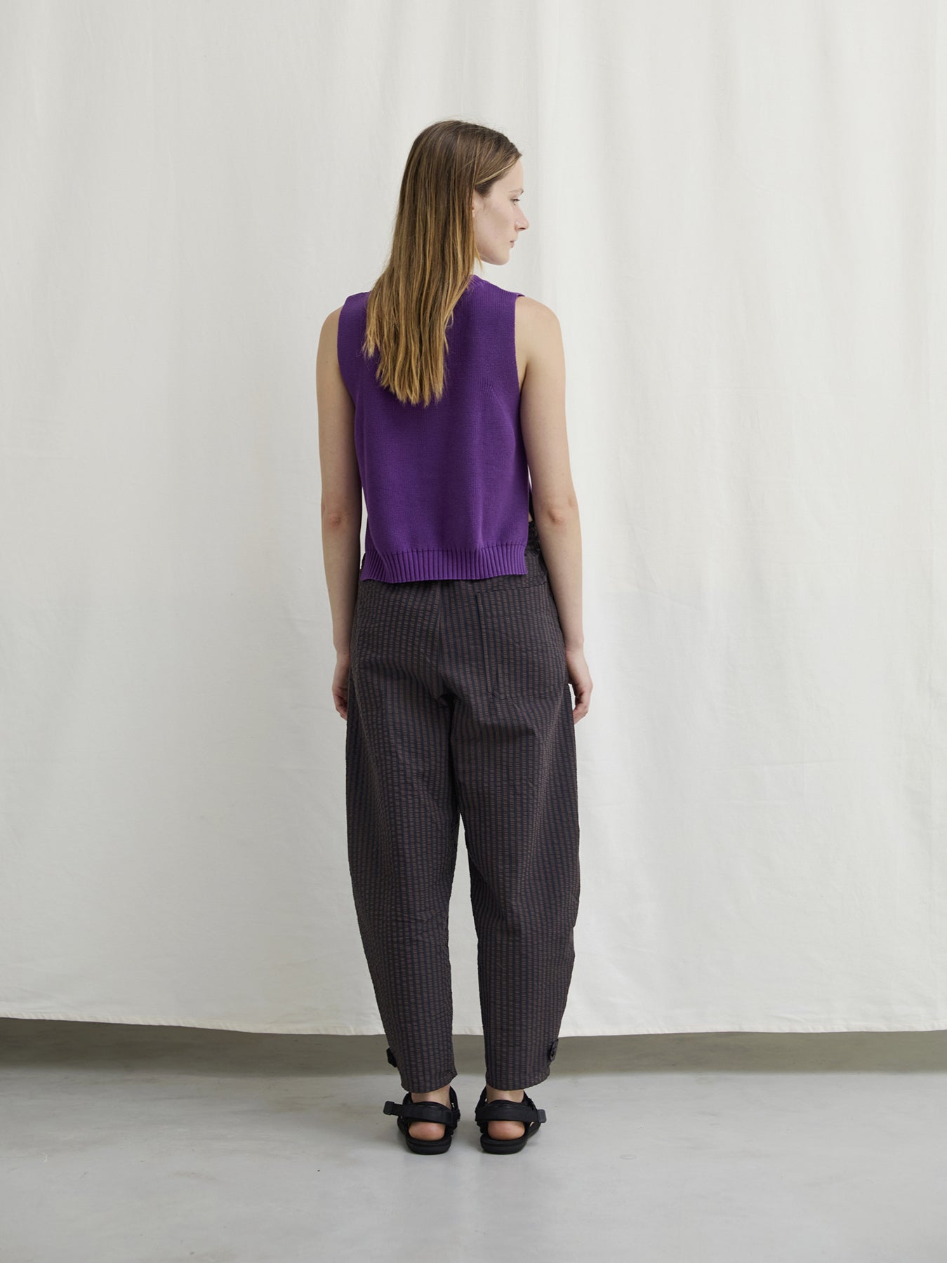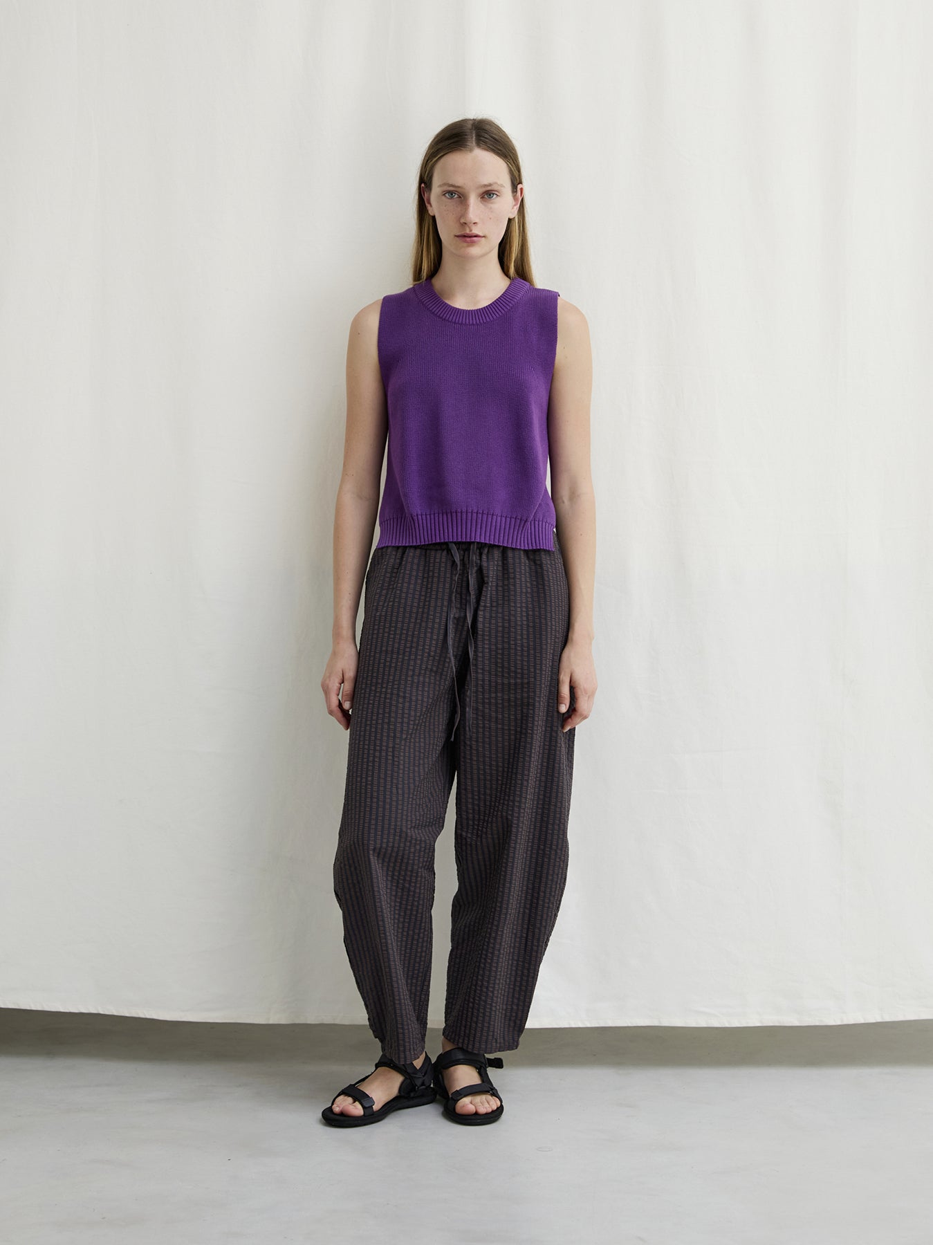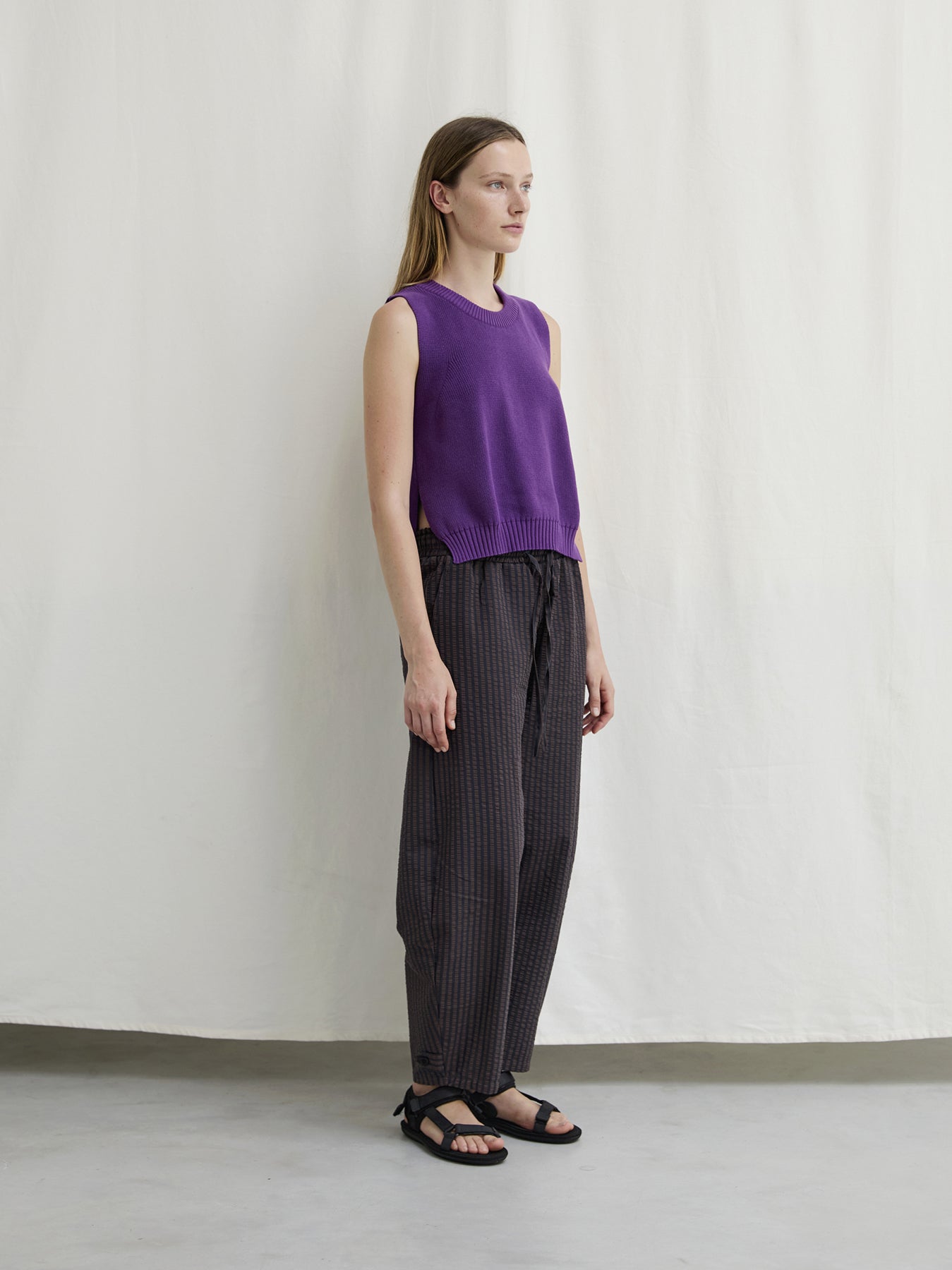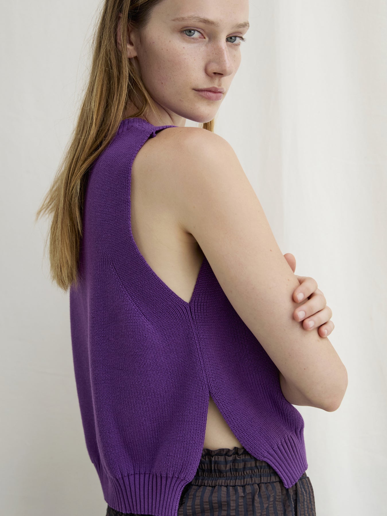 A sleeveless fisherman-rib top with fully fashioned edges and generous side slits, crafted from superior Egyptian cotton yarn. This versatile, casual piece offers a flattering fit and clean finish. An effortless, timeless essential piece for every summer.