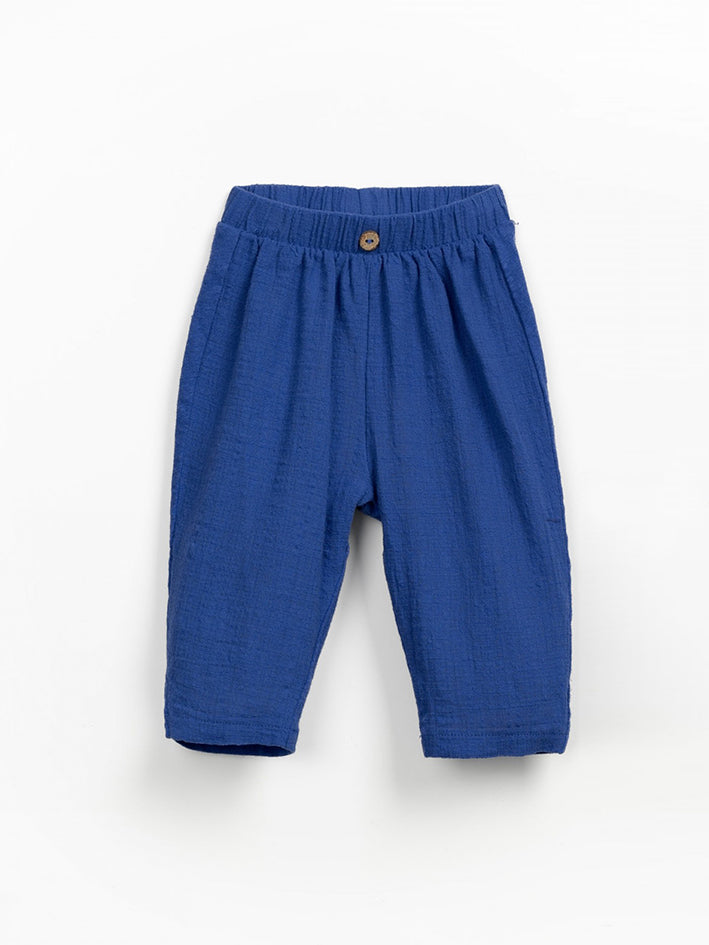 These Play Up Trousers are made of fabric with a blend of organic cotton and linen, in Telo Blue color. It is a wide-leg model with an elastic waistband, a front coconut button, and slightly folded edges. 75.0% Organic Cotton,25.0% Linen