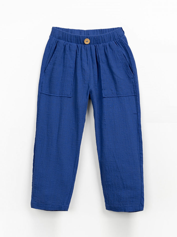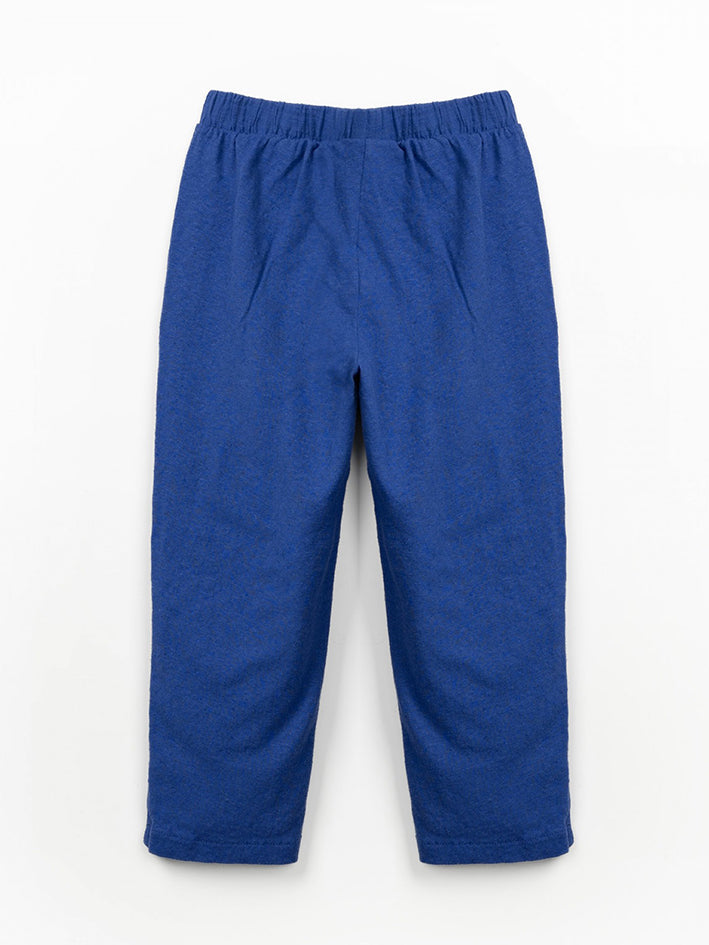 These Play Up Trousers are made from a fabric blend of organic cotton and linen, in the Telo Blue color. They feature a loose fit, elastic waistband, coconut button, two large pockets, and simple hem finishing. 75.0% Organic Cotton,25.0% Linen