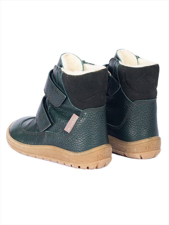 Classic water repellent leather TEX Boot in Deep Teal with a spacious fit. The boot features adjustable Velcro straps, breathable wool lining and a light, soft and flexible ANGULUS rubber sole with logo at the heel and a fixed heel cap with padded collar for extra comfort and support. Crafted in natural and breathable leather with a PFAS-free TEX membrane. Designed in Denmark and handmade with love in Portugal. Always measure your child's foot before buying to ensure you get the right size. We recommend a growth allowance of 1-1.5 cm.