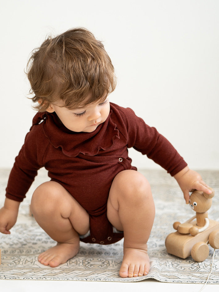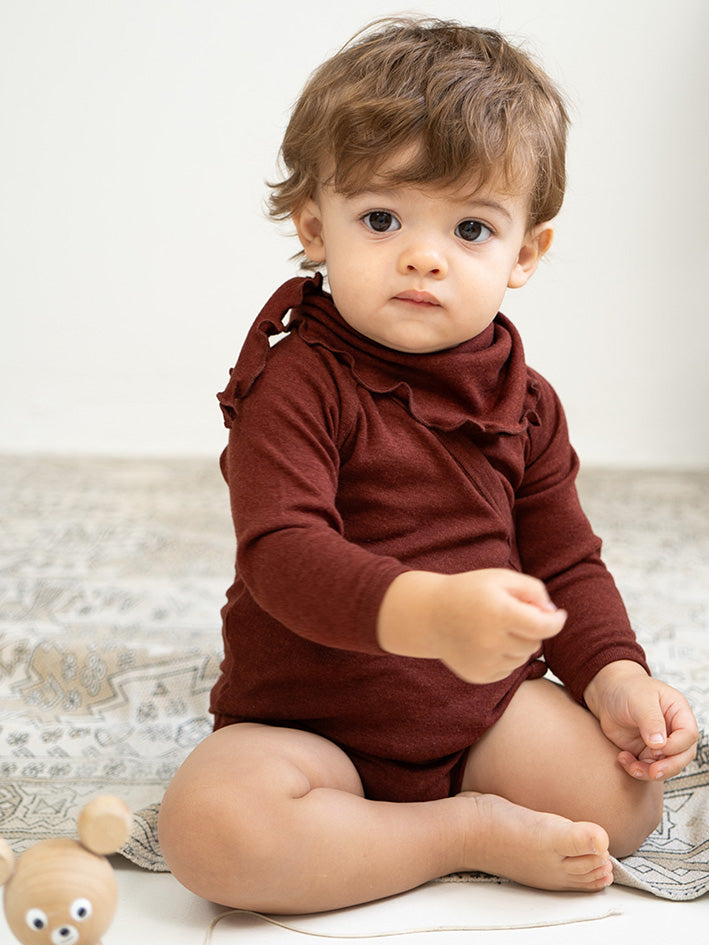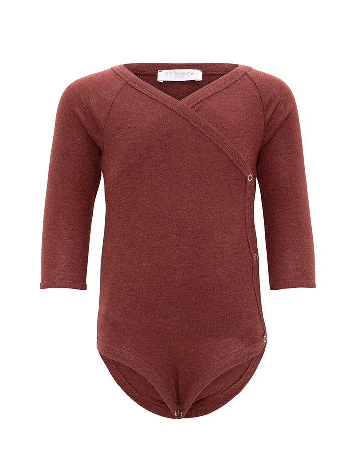 Comfortable and cosy Tickle Wrap-Body Hibiscus by Minimalisma in soft wool-silk blend. The body offers easy dressing with insides YKK snap-buttons and beautiful shell buttons on the visible side. The Rose Blush version comes with a fine scallop stitch detail around the opening. Quality: 70% Wool, 30% Silk