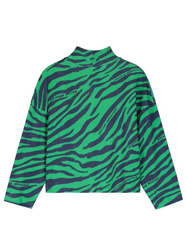 The Maison Mangostan Tiger Turtleneck T-shirt in Mentha green, with a relaxed fit, features an animal print and Long Sleeves. Composition: 95% organic cotton, 5% elastane This item is normally sized, we suggest you select your regular size.