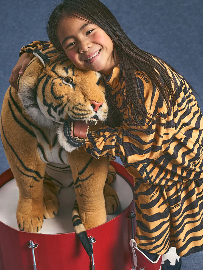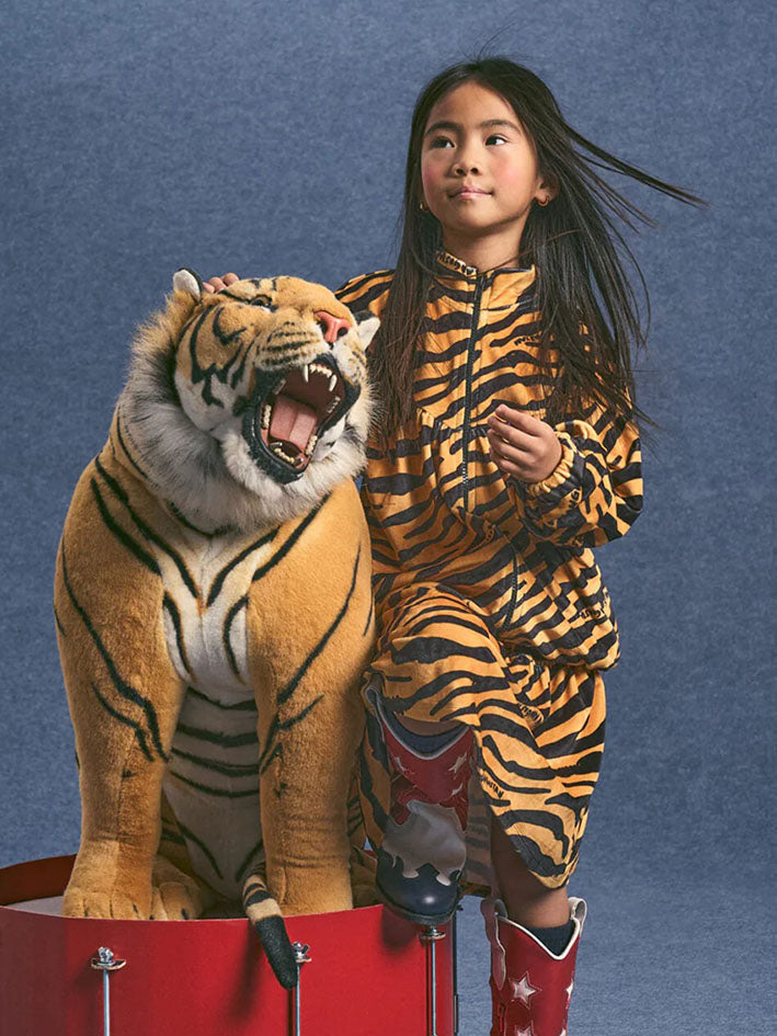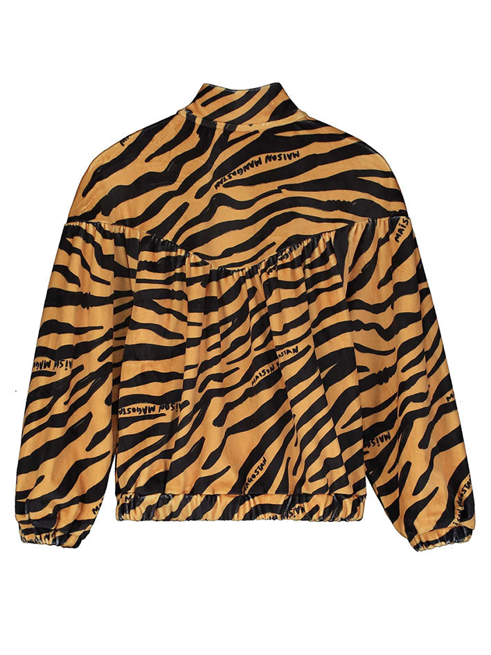 The Tiger Zip-up Jacket in Curry by Maison Mangostan features an animal print, long sleeves and zip-up closure. Composition: 92% polyester, 8% elastane This item is normally sized, we suggest you select your regular size.