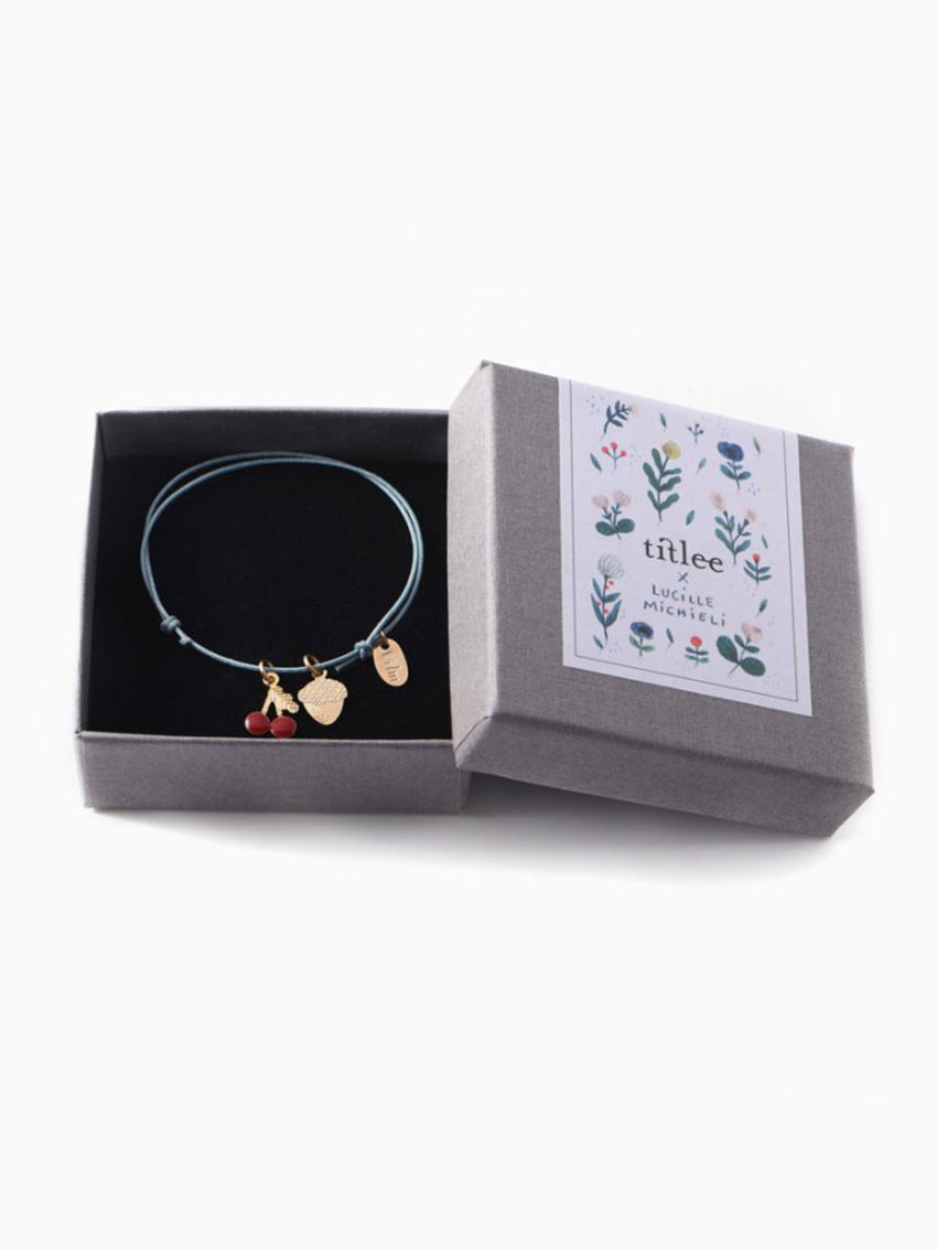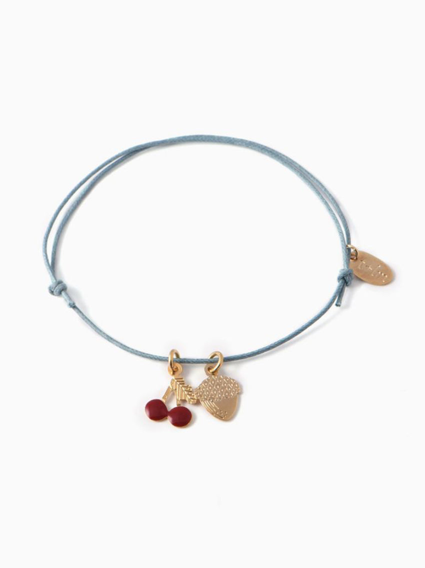 Adjustable bracelet with 2 pendants gilt and enameled brass on cotton thread.