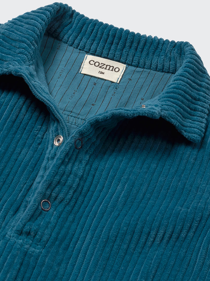 Super soft and cozy wide Trento Corduroy Jumpsuit in Midnight Blue by My Little Cozmo made from OCS and OEKO-TEX certified organic cotton. It features a shirt collar, button placket at the front, and rolled-up cuffs. Snap buttons run along the legs for easy dressing. The jumpsuit has a yoke and patch pockets at the back with contrasting corduroy details. Lined with signature ‘Cozmo’ fabric, it’s gentle to the touch and pleasantly snug—perfect for babies. Gentle texture, ideal for sensitive skin. Structured yet flexible for a snug, comfy fit. Gentle on the skin and the planet. A sustainable choice for your baby’s wardrobe. 100% organic cotton. Woven