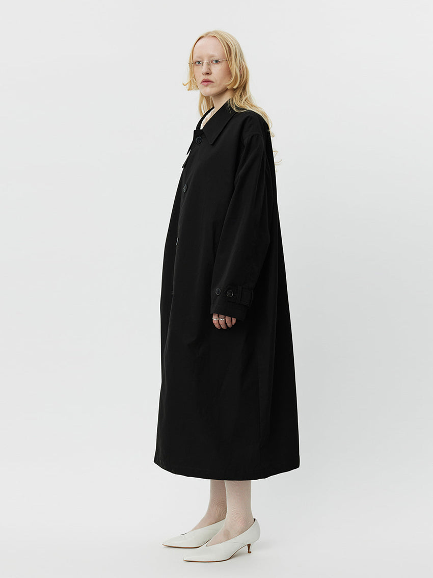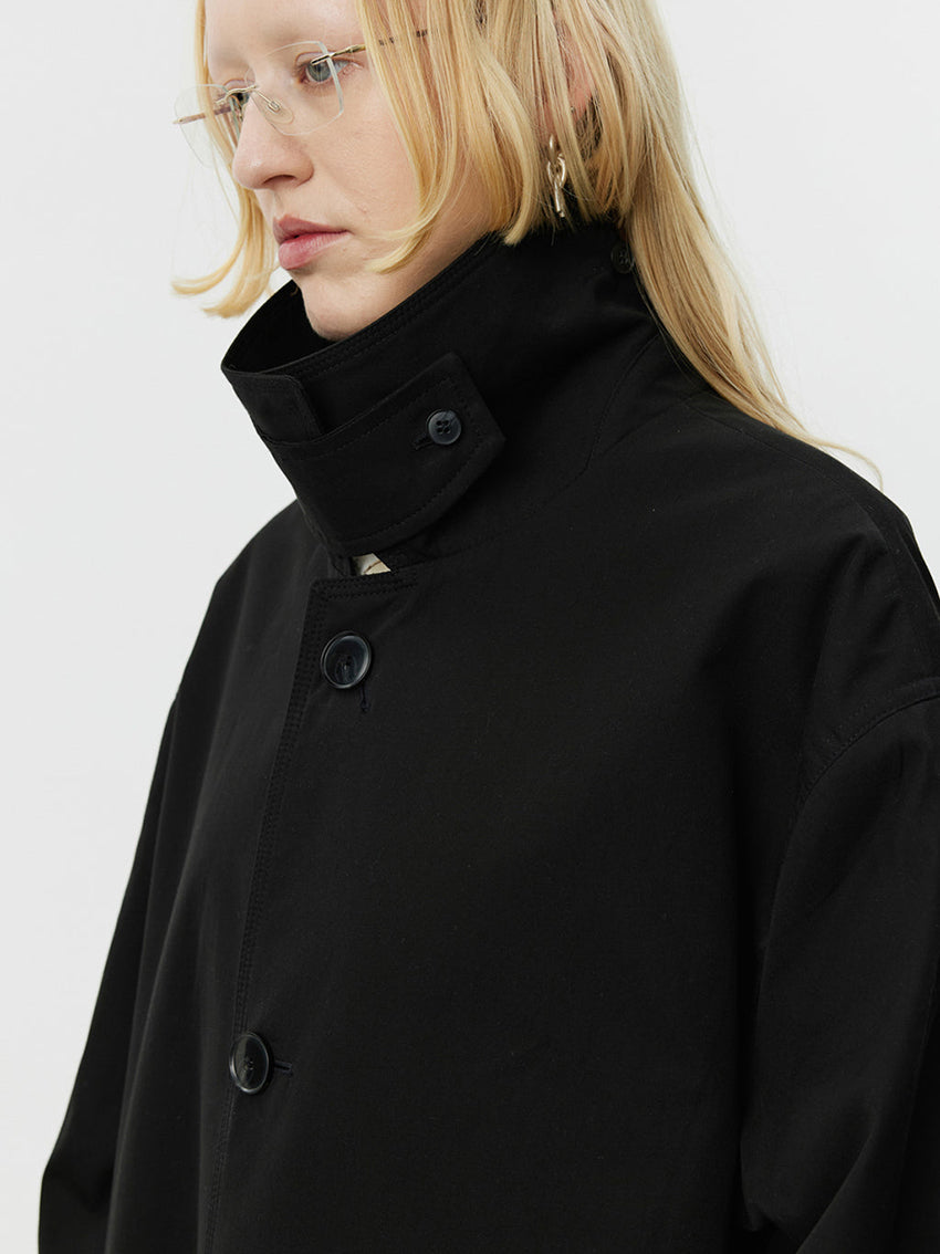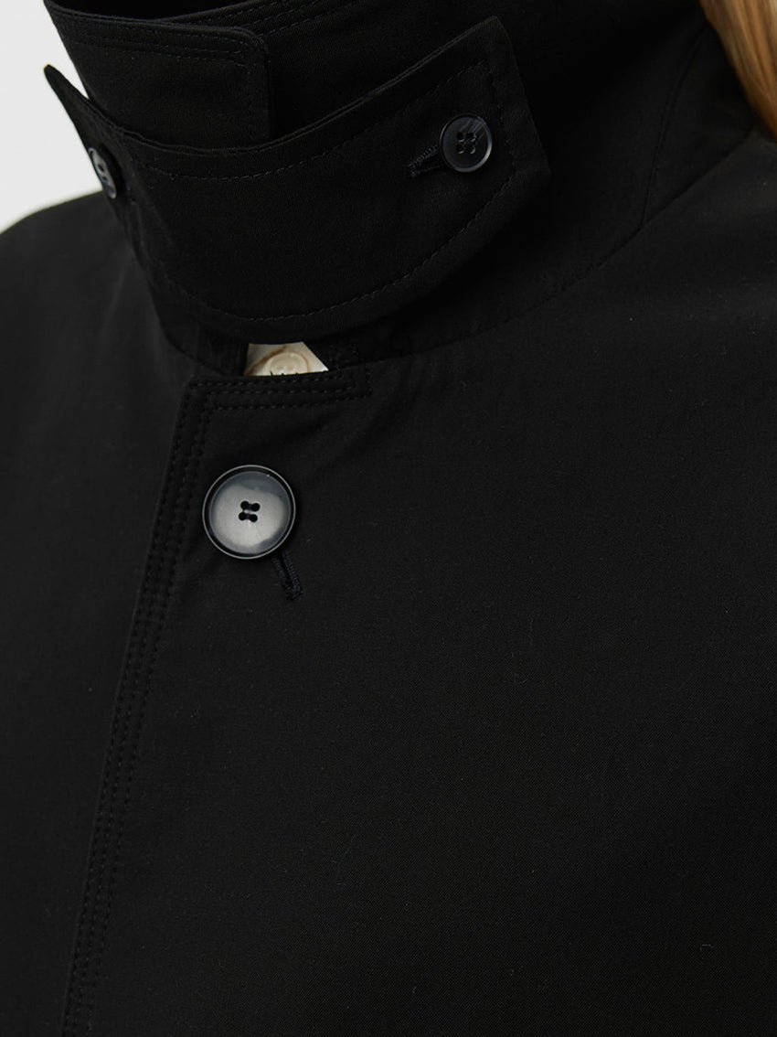 Cut from a coated water resistant Italian deadstock cotton in black.