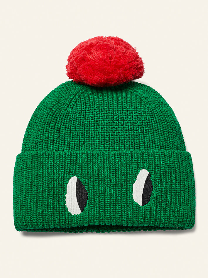 Full of character, this bold knitted Pom Pom Beanie in Python Green by Wynken is made from 100% cotton and topped with a playful pompom. A cheeky pair of embroidered eyes peek out from the turned-up edge, adding a wink of fun to chilly-day dressing. Soft, snug, and ready to turn heads.