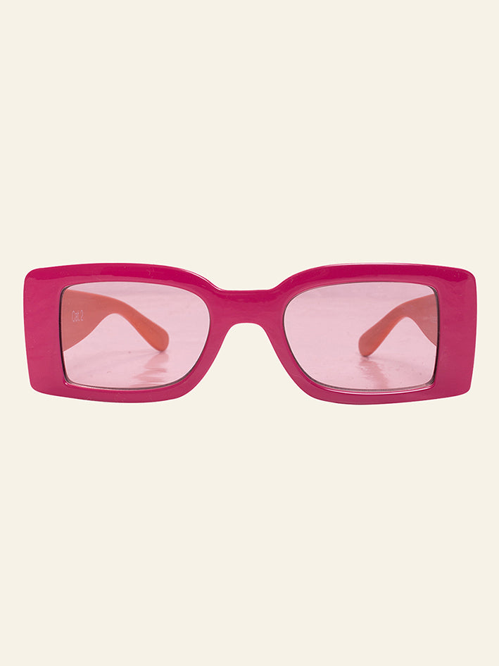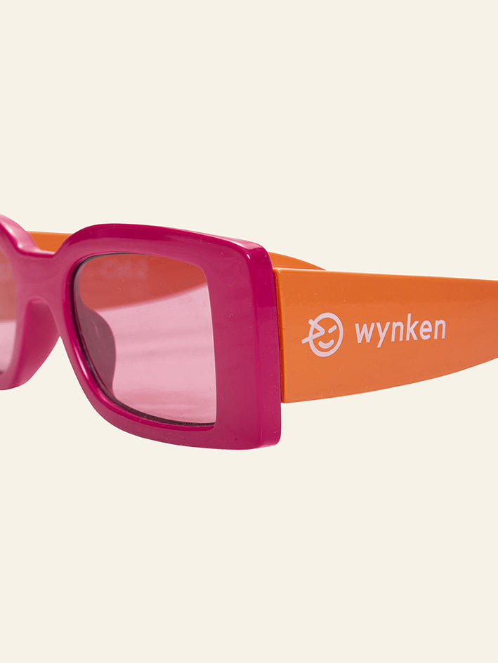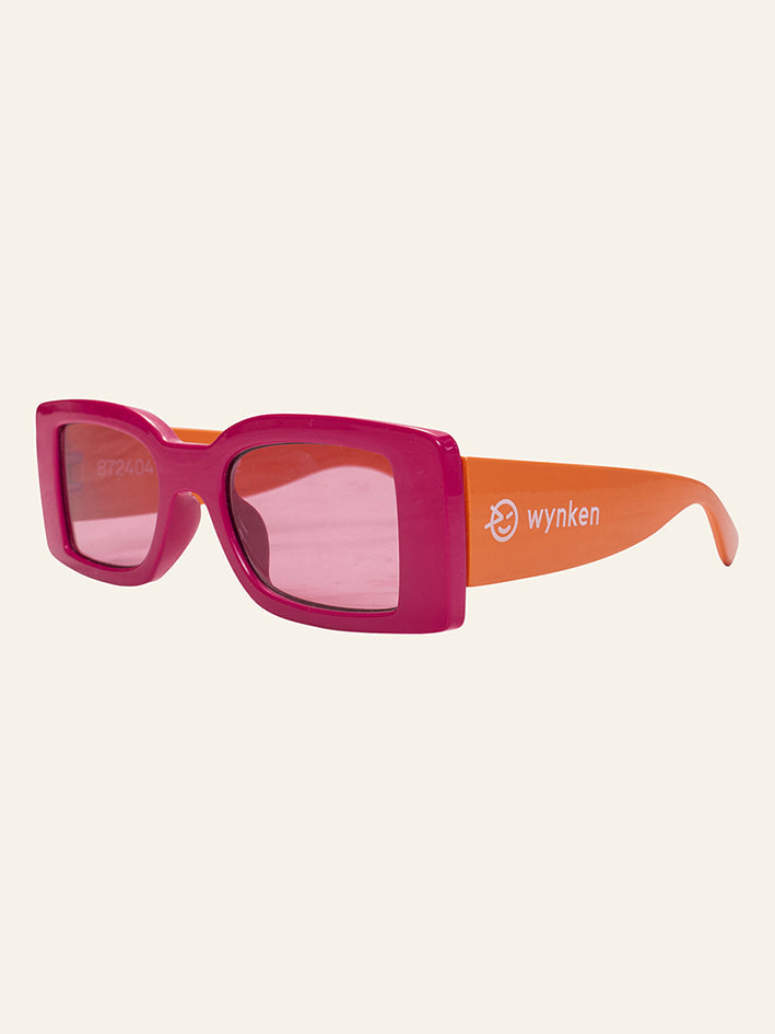 Chunky square framed Sunglasses by Wynken / Magenta frame with Naranja temple / comes with cleaning cloth & sunglass case /Lenses 100% recycled, made from water bottles & caps, food containers / BPA FREE and fully recyclable at end of life / Frames TritanTM Renew with 50% recycled material