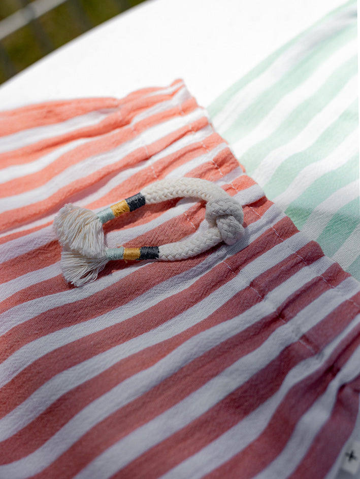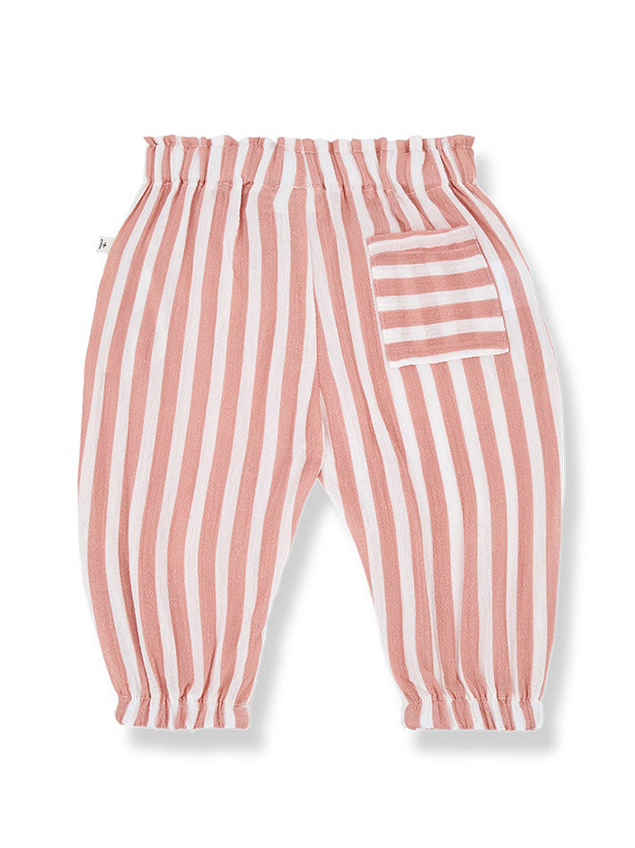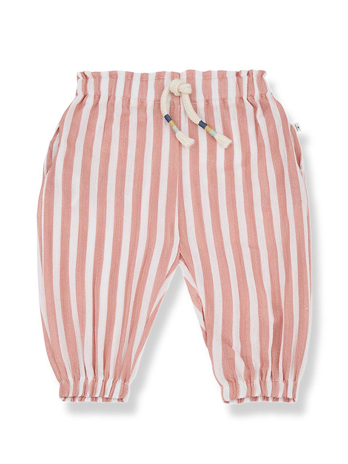 These beautiful Zoe Pants in Coral by 1 + In The Family are made in a light color with all-over coral stripe, a vertical stripe design in coral pink color. The pants have a baggy fit, elastic in the waist, two slit pockets, a back pocket and an elastic band at the ankles. The long pants have a comfortable fit due to the soft cotton fabric and fine fit. Material composition: 100% cotton
