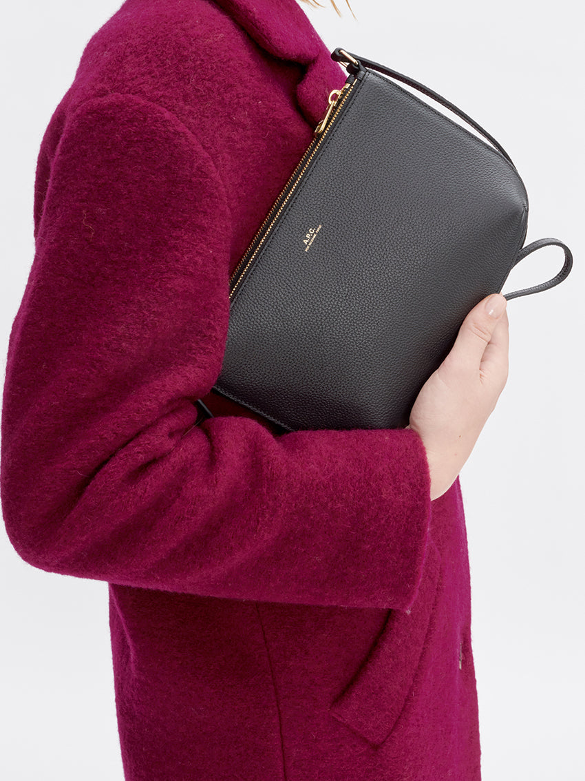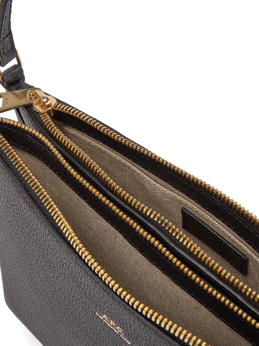 The A.P.C. Sarah Shoulder Bag in Black is made of grained leather Closes with zipper Length-adjustable shoulder strap Two main compartments inside A slot for smartphone etc. Label print on the front 25 x 18 x 5 cm (H x W x D) Shoulder strap: from 106 to 117 cm