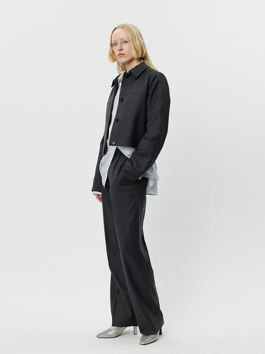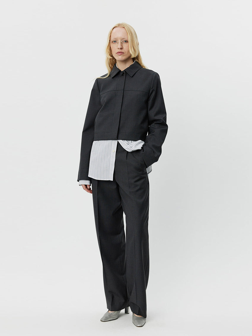 Cut from an Italian deadstock wool with a fine grey multi stripe on a grey ground.