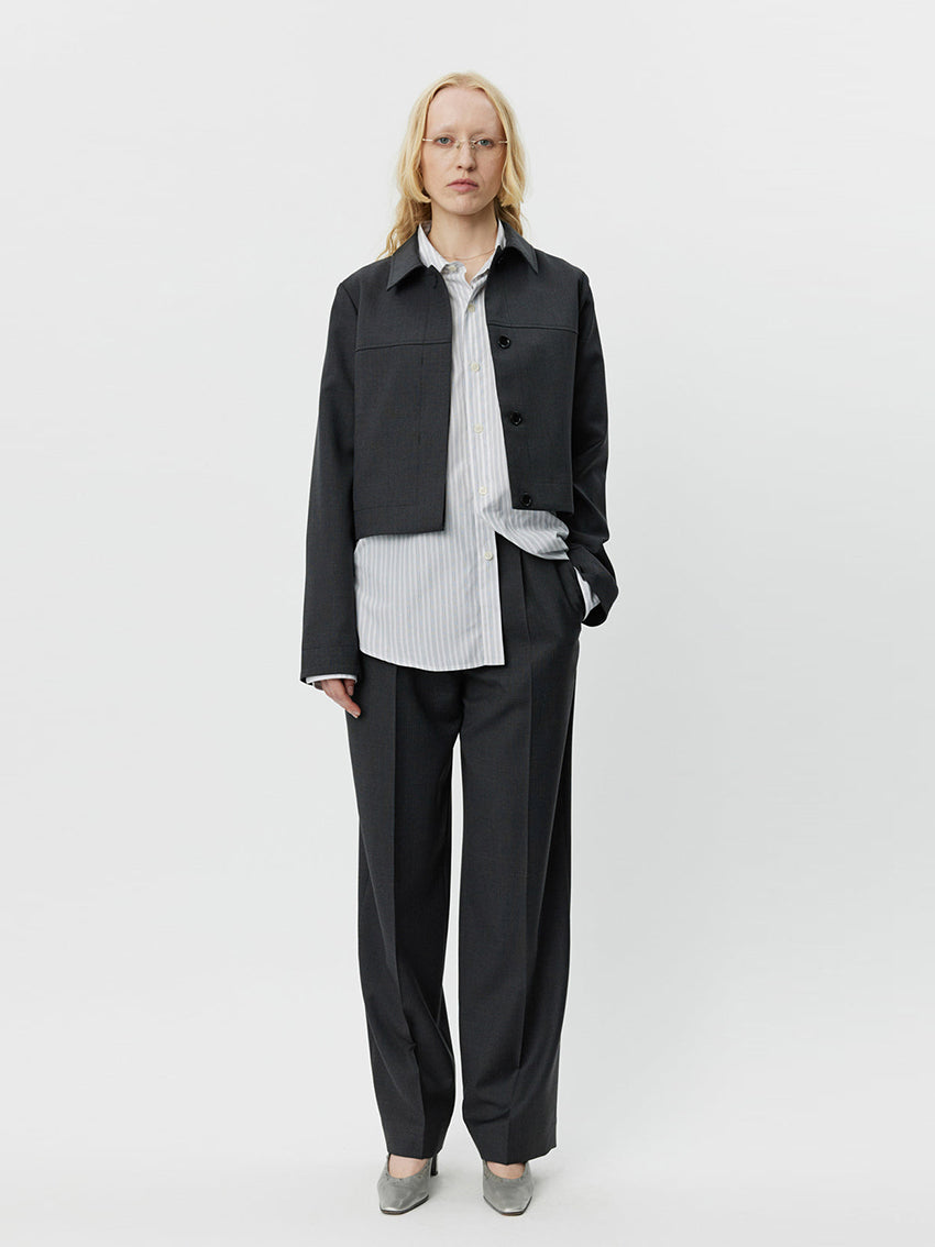 The Above Jacket Grey 50`s Stripe by Mfpen has a cropped fit with shoulder pads.
