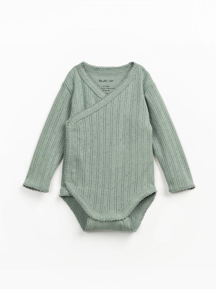 This Play Up Bodysuit is made of jersey fabric with a blend of organic cotton and recycled cotton, in Madalena color. It is an inner model with long sleeves and a V-neckline, featuring a wrap-over opening with a snap button on the inside and outside, and a crotch opening with nickel-free metal snaps. 50.0% Organic Cotton,50.0% Recycled Cotton