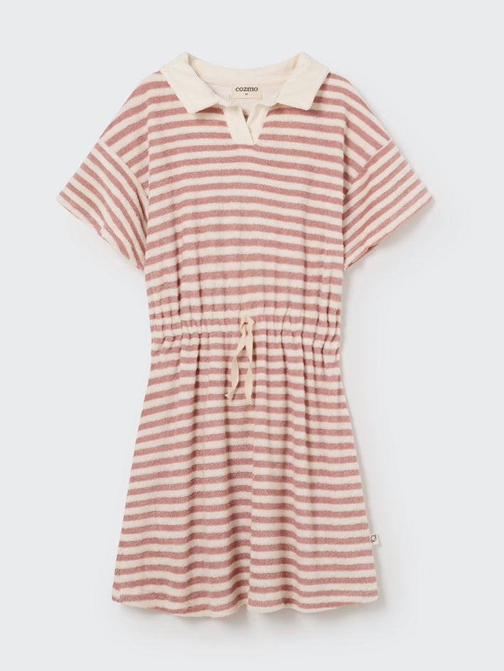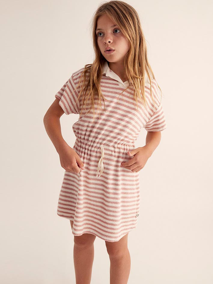 The My Little Cozmo Amira Toweling Dress Stripe in Rose is made in 44% Organic Cotton, 44% Viscose and 12% Recycled Polyester. Made in Spain.