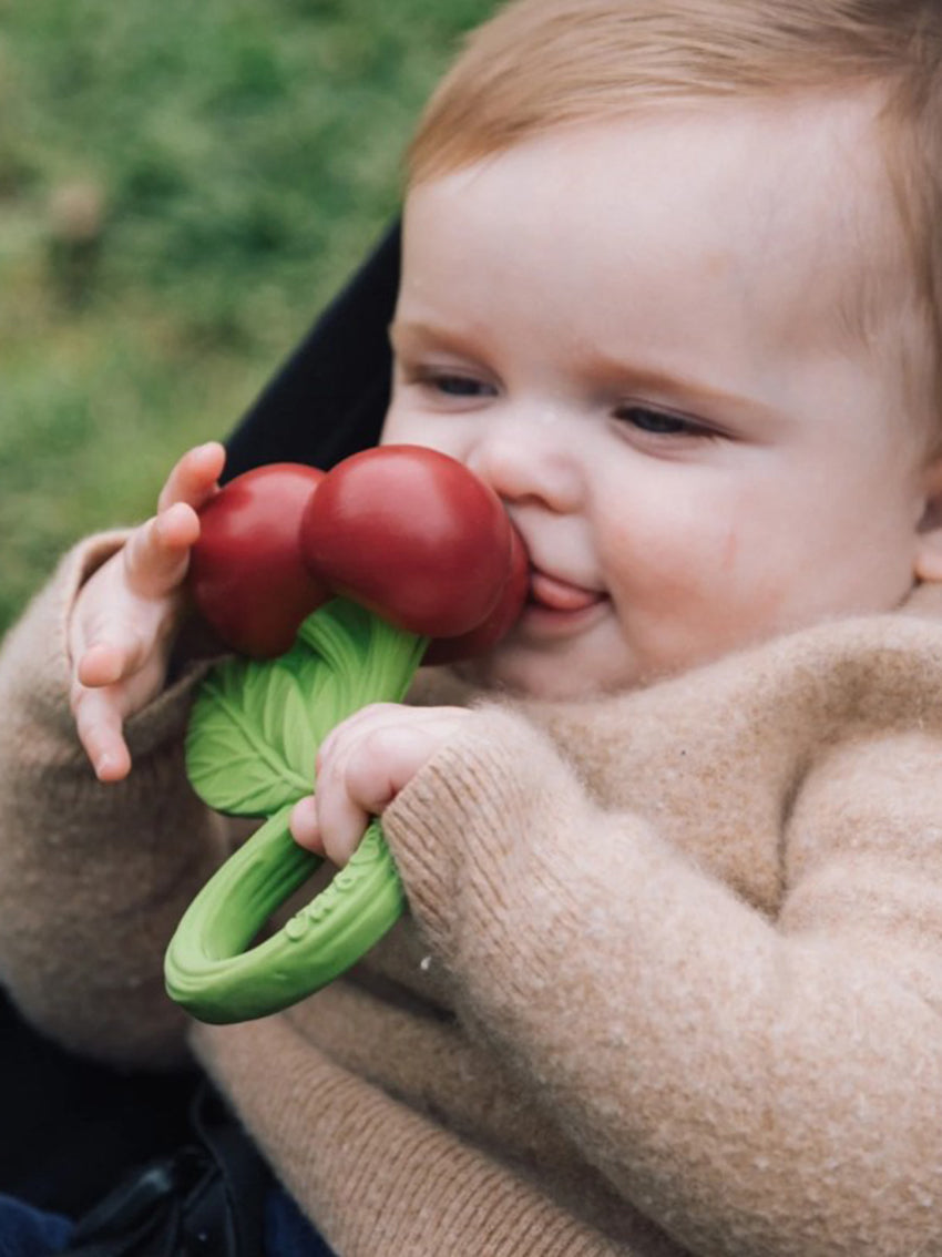 The Oli & Carol Tomato Toy is a soothing 2-in-1 baby teether and rattle, thoughtfully designed to comfort and stimulate little ones. Made from 100% natural rubber, it is filled with upcycled cherry seeds that create a soft, calming sound inspired by nature.