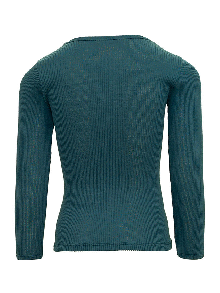 Round-neck long-sleeve Atlantick Tee in Ocean by Minimalisma in soft merino wool. This blouse is seamless and has a double-stitch rib which gives a beautiful straight look when worn. Suitable for boys and girls. Use it as an extra thermal layer or with Arona leggings for a warm and soft pyjamas. Guaranteed to keep your child warm and snug throughout the winter. Wool is naturally antibacterial, making it an excellent choice as a first layer. Quality: 100% Merino Wool